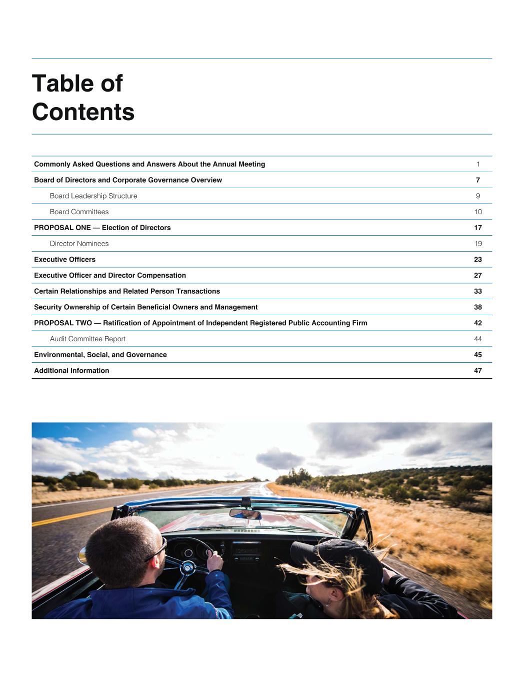 Table of Contents Commonly Asked Questions and Answers About the Annual Meeting 1 Board of Directors and Corporate Governance Overview 7 Board Leadership Structure 9 Board Committees 10 PROPOSAL ONE — Election of Directors 17 Director Nominees 19 Executive Officers 23 Executive Officer and Director Compensation 27 Certain Relationships and Related Person Transactions 33 Security Ownership of Certain Beneficial Owners and Management 38 PROPOSAL TWO — Ratification of Appointment of Independent Registered Public Accounting Firm 42 Audit Committee Report 44 Environmental, Social, and Governance 45 Additional Information 47