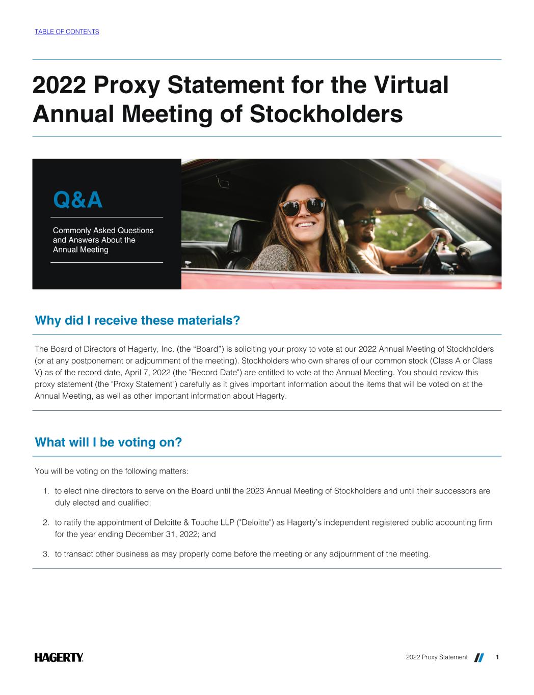 2022 Proxy Statement for the Virtual Annual Meeting of Stockholders Q&A Commonly Asked Questions and Answers About the Annual Meeting Why did I receive these materials? The Board of Directors of Hagerty, Inc. (the “Board”) is soliciting your proxy to vote at our 2022 Annual Meeting of Stockholders (or at any postponement or adjournment of the meeting). Stockholders who own shares of our common stock (Class A or Class V) as of the record date, April 7, 2022 (the "Record Date") are entitled to vote at the Annual Meeting. You should review this proxy statement (the "Proxy Statement") carefully as it gives important information about the items that will be voted on at the Annual Meeting, as well as other important information about Hagerty. What will I be voting on? You will be voting on the following matters: 1. to elect nine directors to serve on the Board until the 2023 Annual Meeting of Stockholders and until their successors are duly elected and qualified; 2. to ratify the appointment of Deloitte & Touche LLP ("Deloitte") as Hagerty’s independent registered public accounting firm for the year ending December 31, 2022; and 3. to transact other business as may properly come before the meeting or any adjournment of the meeting. TABLE OF CONTENTS 2022 Proxy Statement 1