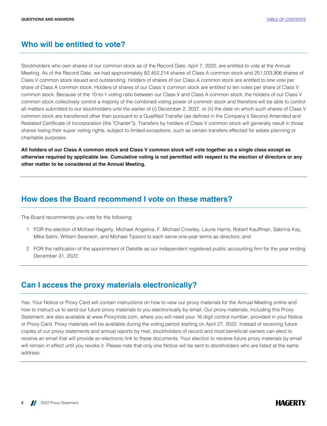 Who will be entitled to vote? Stockholders who own shares of our common stock as of the Record Date, April 7, 2022, are entitled to vote at the Annual Meeting. As of the Record Date, we had approximately 82,452,214 shares of Class A common stock and 251,033,906 shares of Class V common stock issued and outstanding. Holders of shares of our Class A common stock are entitled to one vote per share of Class A common stock. Holders of shares of our Class V common stock are entitled to ten votes per share of Class V common stock. Because of the 10-to-1 voting ratio between our Class V and Class A common stock, the holders of our Class V common stock collectively control a majority of the combined voting power of common stock and therefore will be able to control all matters submitted to our stockholders until the earlier of (i) December 2, 2037, or (ii) the date on which such shares of Class V common stock are transferred other than pursuant to a Qualified Transfer (as defined in the Company’s Second Amended and Restated Certificate of Incorporation (the "Charter")). Transfers by holders of Class V common stock will generally result in those shares losing their super voting rights, subject to limited exceptions, such as certain transfers effected for estate planning or charitable purposes. All holders of our Class A common stock and Class V common stock will vote together as a single class except as otherwise required by applicable law. Cumulative voting is not permitted with respect to the election of directors or any other matter to be considered at the Annual Meeting. How does the Board recommend I vote on these matters? The Board recommends you vote for the following: 1. FOR the election of McKeel Hagerty, Michael Angelina, F. Michael Crowley, Laurie Harris, Robert Kauffman, Sabrina Kay, Mika Salmi, William Swanson, and Michael Tipsord to each serve one-year terms as directors; and 2. FOR the ratification of the appointment of Deloitte as our independent registered public accounting firm for the year ending December 31, 2022. Can I access the proxy materials electronically? Yes. Your Notice or Proxy Card will contain instructions on how to view our proxy materials for the Annual Meeting online and how to instruct us to send our future proxy materials to you electronically by email. Our proxy materials, including this Proxy Statement, are also available at www.ProxyVote.com, where you will need your 16 digit control number, provided in your Notice or Proxy Card. Proxy materials will be available during the voting period starting on April 27, 2022. Instead of receiving future copies of our proxy statements and annual reports by mail, stockholders of record and most beneficial owners can elect to receive an email that will provide an electronic link to these documents. Your election to receive future proxy materials by email will remain in effect until you revoke it. Please note that only one Notice will be sent to stockholders who are listed at the same address. QUESTIONS AND ANSWERS TABLE OF CONTENTS 2 2022 Proxy Statement