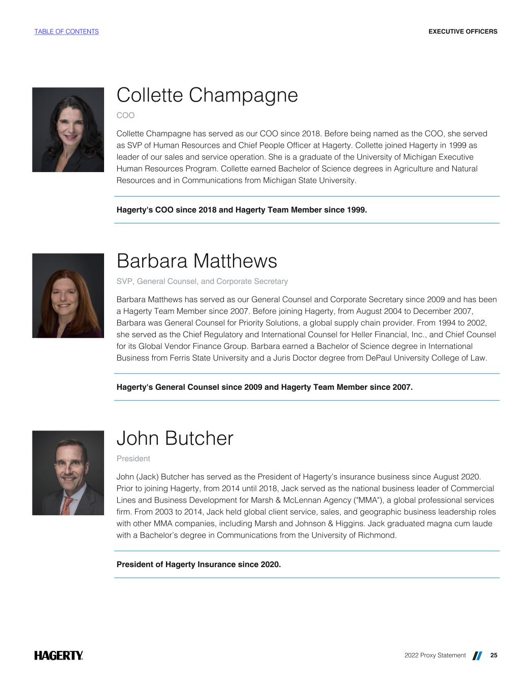 Collette Champagne COO Collette Champagne has served as our COO since 2018. Before being named as the COO, she served as SVP of Human Resources and Chief People Officer at Hagerty. Collette joined Hagerty in 1999 as leader of our sales and service operation. She is a graduate of the University of Michigan Executive Human Resources Program. Collette earned Bachelor of Science degrees in Agriculture and Natural Resources and in Communications from Michigan State University. Hagerty's COO since 2018 and Hagerty Team Member since 1999. Barbara Matthews SVP, General Counsel, and Corporate Secretary Barbara Matthews has served as our General Counsel and Corporate Secretary since 2009 and has been a Hagerty Team Member since 2007. Before joining Hagerty, from August 2004 to December 2007, Barbara was General Counsel for Priority Solutions, a global supply chain provider. From 1994 to 2002, she served as the Chief Regulatory and International Counsel for Heller Financial, Inc., and Chief Counsel for its Global Vendor Finance Group. Barbara earned a Bachelor of Science degree in International Business from Ferris State University and a Juris Doctor degree from DePaul University College of Law. Hagerty's General Counsel since 2009 and Hagerty Team Member since 2007. John Butcher President John (Jack) Butcher has served as the President of Hagerty’s insurance business since August 2020. Prior to joining Hagerty, from 2014 until 2018, Jack served as the national business leader of Commercial Lines and Business Development for Marsh & McLennan Agency ("MMA"), a global professional services firm. From 2003 to 2014, Jack held global client service, sales, and geographic business leadership roles with other MMA companies, including Marsh and Johnson & Higgins. Jack graduated magna cum laude with a Bachelor’s degree in Communications from the University of Richmond. President of Hagerty Insurance since 2020. TABLE OF CONTENTS EXECUTIVE OFFICERS 2022 Proxy Statement 25