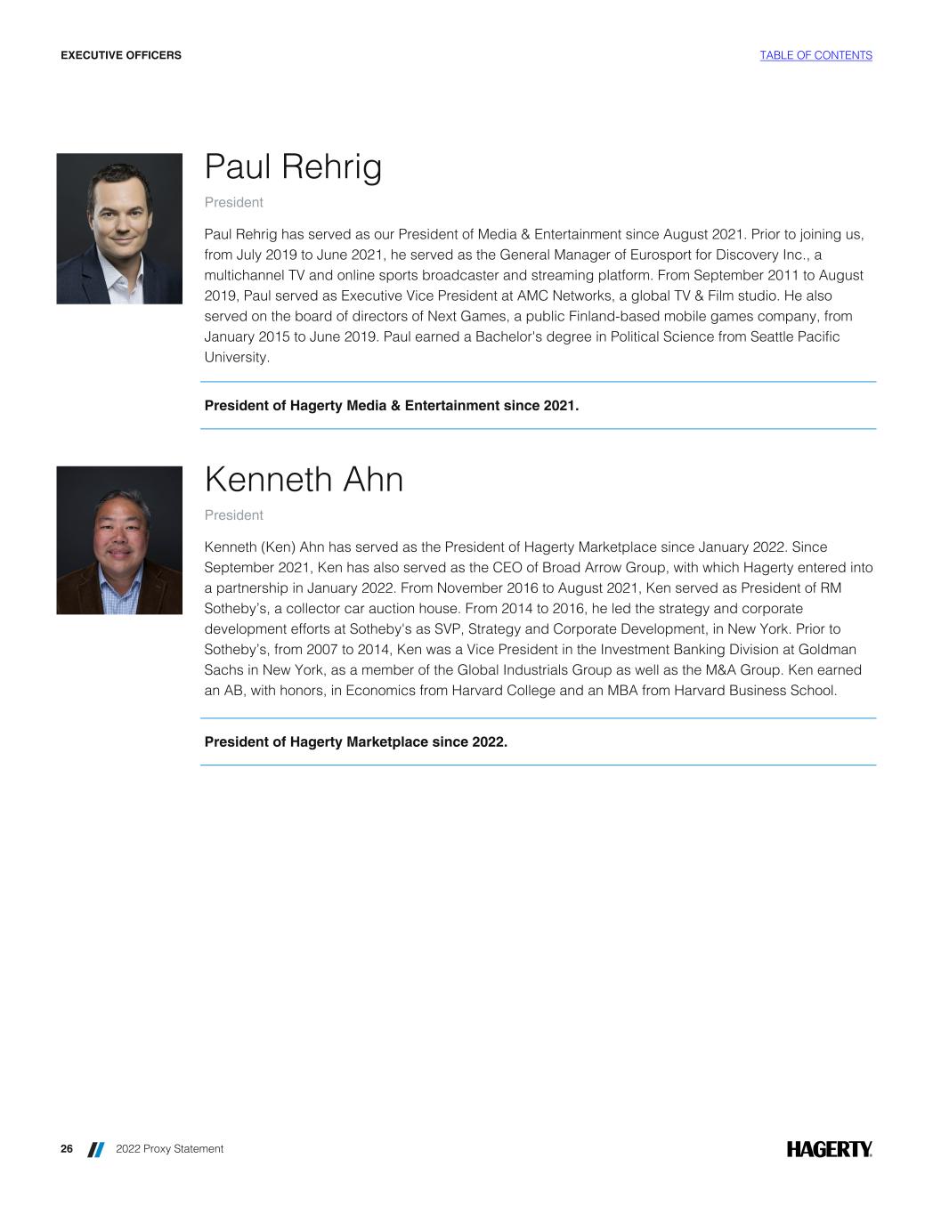 Paul Rehrig President Paul Rehrig has served as our President of Media & Entertainment since August 2021. Prior to joining us, from July 2019 to June 2021, he served as the General Manager of Eurosport for Discovery Inc., a multichannel TV and online sports broadcaster and streaming platform. From September 2011 to August 2019, Paul served as Executive Vice President at AMC Networks, a global TV & Film studio. He also served on the board of directors of Next Games, a public Finland-based mobile games company, from January 2015 to June 2019. Paul earned a Bachelor's degree in Political Science from Seattle Pacific University. President of Hagerty Media & Entertainment since 2021. Kenneth Ahn President Kenneth (Ken) Ahn has served as the President of Hagerty Marketplace since January 2022. Since September 2021, Ken has also served as the CEO of Broad Arrow Group, with which Hagerty entered into a partnership in January 2022. From November 2016 to August 2021, Ken served as President of RM Sotheby’s, a collector car auction house. From 2014 to 2016, he led the strategy and corporate development efforts at Sotheby's as SVP, Strategy and Corporate Development, in New York. Prior to Sotheby’s, from 2007 to 2014, Ken was a Vice President in the Investment Banking Division at Goldman Sachs in New York, as a member of the Global Industrials Group as well as the M&A Group. Ken earned an AB, with honors, in Economics from Harvard College and an MBA from Harvard Business School. President of Hagerty Marketplace since 2022. EXECUTIVE OFFICERS TABLE OF CONTENTS 26 2022 Proxy Statement