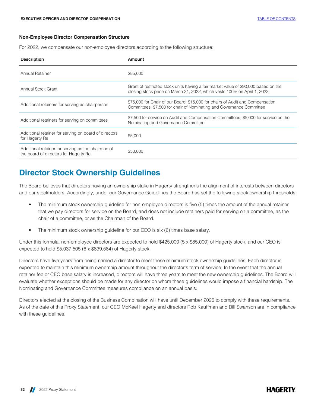 Non-Employee Director Compensation Structure For 2022, we compensate our non-employee directors according to the following structure: Description Amount Annual Retainer $85,000 Annual Stock Grant Grant of restricted stock units having a fair market value of $90,000 based on the closing stock price on March 31, 2022, which vests 100% on April 1, 2023 Additional retainers for serving as chairperson $75,000 for Chair of our Board; $15,000 for chairs of Audit and Compensation Committees; $7,500 for chair of Nominating and Governance Committee Additional retainers for serving on committees $7,500 for service on Audit and Compensation Committees; $5,000 for service on the Nominating and Governance Committee Additional retainer for serving on board of directors for Hagerty Re $5,000 Additional retainer for serving as the chairman of the board of directors for Hagerty Re $50,000 Director Stock Ownership Guidelines The Board believes that directors having an ownership stake in Hagerty strengthens the alignment of interests between directors and our stockholders. Accordingly, under our Governance Guidelines the Board has set the following stock ownership thresholds: • The minimum stock ownership guideline for non-employee directors is five (5) times the amount of the annual retainer that we pay directors for service on the Board, and does not include retainers paid for serving on a committee, as the chair of a committee, or as the Chairman of the Board. • The minimum stock ownership guideline for our CEO is six (6) times base salary. Under this formula, non-employee directors are expected to hold $425,000 (5 x $85,000) of Hagerty stock, and our CEO is expected to hold $5,037,505 (6 x $839,584) of Hagerty stock. Directors have five years from being named a director to meet these minimum stock ownership guidelines. Each director is expected to maintain this minimum ownership amount throughout the director’s term of service. In the event that the annual retainer fee or CEO base salary is increased, directors will have three years to meet the new ownership guidelines. The Board will evaluate whether exceptions should be made for any director on whom these guidelines would impose a financial hardship. The Nominating and Governance Committee measures compliance on an annual basis. Directors elected at the closing of the Business Combination will have until December 2026 to comply with these requirements. As of the date of this Proxy Statement, our CEO McKeel Hagerty and directors Rob Kauffman and Bill Swanson are in compliance with these guidelines. EXECUTIVE OFFICER AND DIRECTOR COMPENSATION TABLE OF CONTENTS 32 2022 Proxy Statement