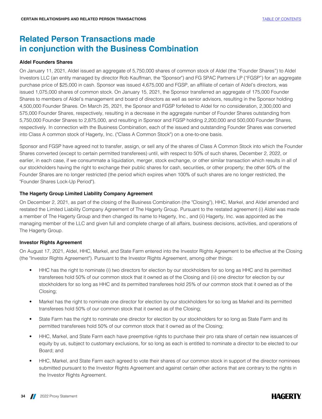 Related Person Transactions made in conjunction with the Business Combination Aldel Founders Shares On January 11, 2021, Aldel issued an aggregate of 5,750,000 shares of common stock of Aldel (the “Founder Shares”) to Aldel Investors LLC (an entity managed by director Rob Kauffman, the "Sponsor") and FG SPAC Partners LP (“FGSP”) for an aggregate purchase price of $25,000 in cash. Sponsor was issued 4,675,000 and FGSP, an affiliate of certain of Aldel’s directors, was issued 1,075,000 shares of common stock. On January 15, 2021, the Sponsor transferred an aggregate of 175,000 Founder Shares to members of Aldel’s management and board of directors as well as senior advisors, resulting in the Sponsor holding 4,500,000 Founder Shares. On March 25, 2021, the Sponsor and FGSP forfeited to Aldel for no consideration, 2,300,000 and 575,000 Founder Shares, respectively, resulting in a decrease in the aggregate number of Founder Shares outstanding from 5,750,000 Founder Shares to 2,875,000, and resulting in Sponsor and FGSP holding 2,200,000 and 500,000 Founder Shares, respectively. In connection with the Business Combination, each of the issued and outstanding Founder Shares was converted into Class A common stock of Hagerty, Inc. ("Class A Common Stock") on a one-to-one basis. Sponsor and FGSP have agreed not to transfer, assign, or sell any of the shares of Class A Common Stock into which the Founder Shares converted (except to certain permitted transferees) until, with respect to 50% of such shares, December 2, 2022, or earlier, in each case, if we consummate a liquidation, merger, stock exchange, or other similar transaction which results in all of our stockholders having the right to exchange their public shares for cash, securities, or other property; the other 50% of the Founder Shares are no longer restricted (the period which expires when 100% of such shares are no longer restricted, the "Founder Shares Lock-Up Period"). The Hagerty Group Limited Liability Company Agreement On December 2, 2021, as part of the closing of the Business Combination (the "Closing"), HHC, Markel, and Aldel amended and restated the Limited Liability Company Agreement of The Hagerty Group. Pursuant to the restated agreement (i) Aldel was made a member of The Hagerty Group and then changed its name to Hagerty, Inc., and (ii) Hagerty, Inc. was appointed as the managing member of the LLC and given full and complete charge of all affairs, business decisions, activities, and operations of The Hagerty Group. Investor Rights Agreement On August 17, 2021, Aldel, HHC, Markel, and State Farm entered into the Investor Rights Agreement to be effective at the Closing (the "Investor Rights Agreement"). Pursuant to the Investor Rights Agreement, among other things: • HHC has the right to nominate (i) two directors for election by our stockholders for so long as HHC and its permitted transferees hold 50% of our common stock that it owned as of the Closing and (ii) one director for election by our stockholders for so long as HHC and its permitted transferees hold 25% of our common stock that it owned as of the Closing; • Markel has the right to nominate one director for election by our stockholders for so long as Markel and its permitted transferees hold 50% of our common stock that it owned as of the Closing; • State Farm has the right to nominate one director for election by our stockholders for so long as State Farm and its permitted transferees hold 50% of our common stock that it owned as of the Closing; • HHC, Markel, and State Farm each have preemptive rights to purchase their pro rata share of certain new issuances of equity by us, subject to customary exclusions, for so long as each is entitled to nominate a director to be elected to our Board; and • HHC, Markel, and State Farm each agreed to vote their shares of our common stock in support of the director nominees submitted pursuant to the Investor Rights Agreement and against certain other actions that are contrary to the rights in the Investor Rights Agreement. CERTAIN RELATIONSHIPS AND RELATED PERSON TRANSACTIONS TABLE OF CONTENTS 34 2022 Proxy Statement