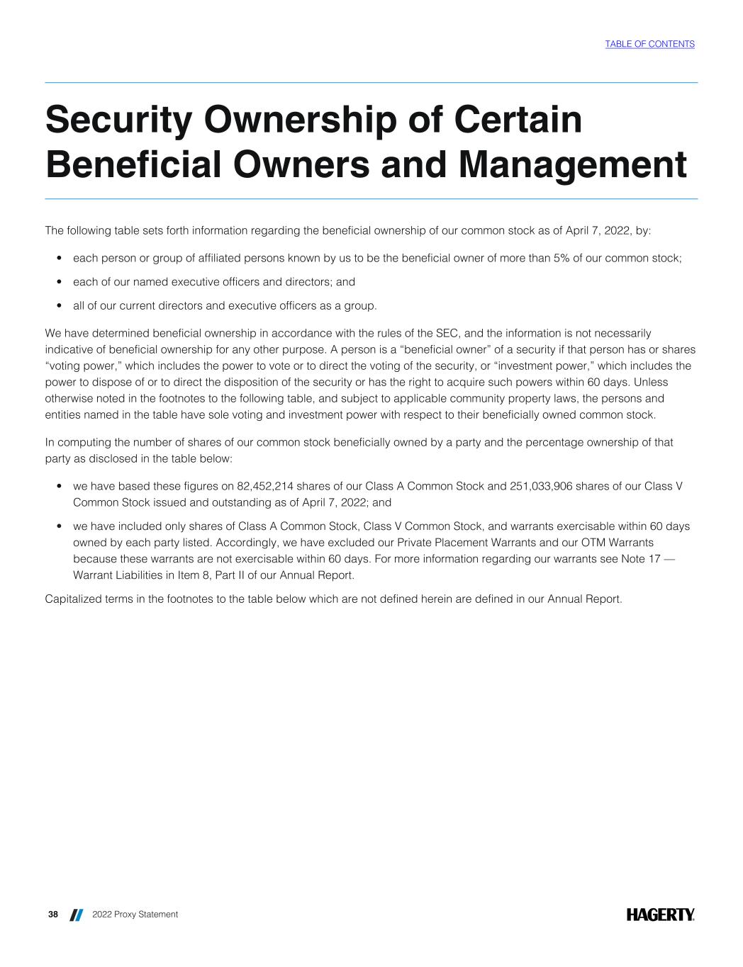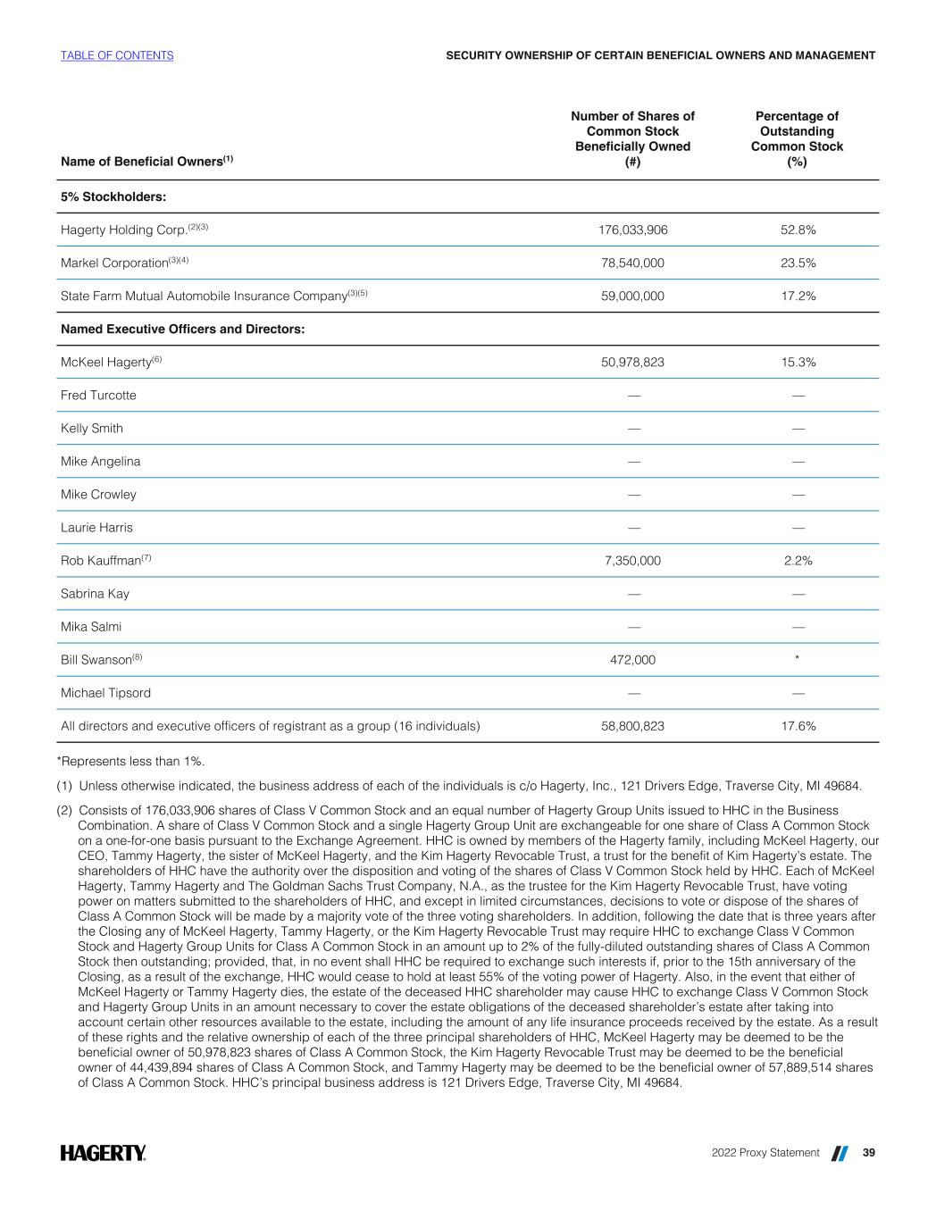 Name of Beneficial Owners(1) Number of Shares of Common Stock Beneficially Owned (#) Percentage of Outstanding Common Stock (%) 5% Stockholders: Hagerty Holding Corp.(2)(3) 176,033,906 52.8% Markel Corporation(3)(4) 78,540,000 23.5% State Farm Mutual Automobile Insurance Company(3)(5) 59,000,000 17.2% Named Executive Officers and Directors: McKeel Hagerty(6) 50,978,823 15.3% Fred Turcotte — — Kelly Smith — — Mike Angelina — — Mike Crowley — — Laurie Harris — — Rob Kauffman(7) 7,350,000 2.2% Sabrina Kay — — Mika Salmi — — Bill Swanson(8) 472,000 * Michael Tipsord — — All directors and executive officers of registrant as a group (16 individuals) 58,800,823 17.6% *Represents less than 1%. (1) Unless otherwise indicated, the business address of each of the individuals is c/o Hagerty, Inc., 121 Drivers Edge, Traverse City, MI 49684. (2) Consists of 176,033,906 shares of Class V Common Stock and an equal number of Hagerty Group Units issued to HHC in the Business Combination. A share of Class V Common Stock and a single Hagerty Group Unit are exchangeable for one share of Class A Common Stock on a one-for-one basis pursuant to the Exchange Agreement. HHC is owned by members of the Hagerty family, including McKeel Hagerty, our CEO, Tammy Hagerty, the sister of McKeel Hagerty, and the Kim Hagerty Revocable Trust, a trust for the benefit of Kim Hagerty’s estate. The shareholders of HHC have the authority over the disposition and voting of the shares of Class V Common Stock held by HHC. Each of McKeel Hagerty, Tammy Hagerty and The Goldman Sachs Trust Company, N.A., as the trustee for the Kim Hagerty Revocable Trust, have voting power on matters submitted to the shareholders of HHC, and except in limited circumstances, decisions to vote or dispose of the shares of Class A Common Stock will be made by a majority vote of the three voting shareholders. In addition, following the date that is three years after the Closing any of McKeel Hagerty, Tammy Hagerty, or the Kim Hagerty Revocable Trust may require HHC to exchange Class V Common Stock and Hagerty Group Units for Class A Common Stock in an amount up to 2% of the fully-diluted outstanding shares of Class A Common Stock then outstanding; provided, that, in no event shall HHC be required to exchange such interests if, prior to the 15th anniversary of the Closing, as a result of the exchange, HHC would cease to hold at least 55% of the voting power of Hagerty. Also, in the event that either of McKeel Hagerty or Tammy Hagerty dies, the estate of the deceased HHC shareholder may cause HHC to exchange Class V Common Stock and Hagerty Group Units in an amount necessary to cover the estate obligations of the deceased shareholder’s estate after taking into account certain other resources available to the estate, including the amount of any life insurance proceeds received by the estate. As a result of these rights and the relative ownership of each of the three principal shareholders of HHC, McKeel Hagerty may be deemed to be the beneficial owner of 50,978,823 shares of Class A Common Stock, the Kim Hagerty Revocable Trust may be deemed to be the beneficial owner of 44,439,894 shares of Class A Common Stock, and Tammy Hagerty may be deemed to be the beneficial owner of 57,889,514 shares of Class A Common Stock. HHC’s principal business address is 121 Drivers Edge, Traverse City, MI 49684. TABLE OF CONTENTS SECURITY OWNERSHIP OF CERTAIN BENEFICIAL OWNERS AND MANAGEMENT 2022 Proxy Statement 39