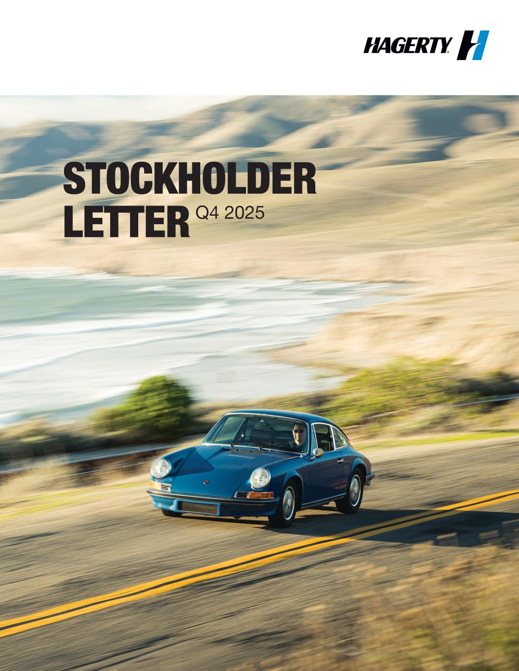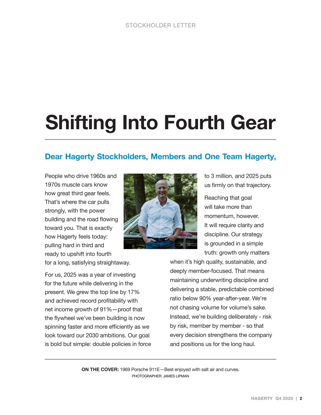 People who drive 1960s and 1970s muscle cars know how great third gear feels. That’s where the car pulls strongly, with the power building and the road flowing toward you. That is exactly how Hagerty feels today: pulling hard in third and ready to upshift into fourth for a long, satisfying straightaway. For us, 2025 was a year of investing for the future while delivering in the present. We grew the top line by 17% and achieved record profitability with net income growth of 91%—proof that the flywheel we’ve been building is now spinning faster and more efficiently as we look toward our 2030 ambitions. Our goal is bold but simple: double policies in force to 3 million, and 2025 puts us firmly on that trajectory. Reaching that goal will take more than momentum, however. It will require clarity and discipline. Our strategy is grounded in a simple truth: growth only matters when it’s high quality, sustainable, and deeply member‑focused. That means maintaining underwriting discipline and delivering a stable, predictable combined ratio below 90% year-after-year. We’re not chasing volume for volume’s sake. Instead, we’re building deliberately - risk by risk, member by member - so that every decision strengthens the company and positions us for the long haul. Dear Hagerty Stockholders, Members and One Team Hagerty, STOCKHOLDER LETTER Shifting Into Fourth Gear ON THE COVER: 1969 Porsche 911E—Best enjoyed with salt air and curves. PHOTOGRAPHER: JAMES LIPMAN HAGERTY Q4 2025 | 2