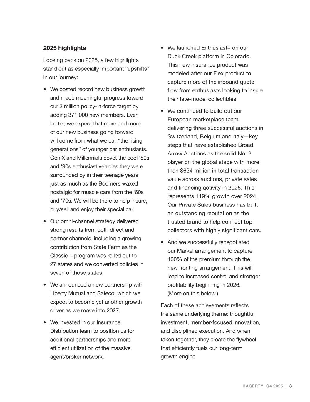 HAGERTY Q4 2025 | 3 2025 highlights Looking back on 2025, a few highlights stand out as especially important “upshifts” in our journey: • We posted record new business growth and made meaningful progress toward our 3 million policy-in-force target by adding 371,000 new members. Even better, we expect that more and more of our new business going forward will come from what we call “the rising generations” of younger car enthusiasts. Gen X and Millennials covet the cool ‘80s and ‘90s enthusiast vehicles they were surrounded by in their teenage years just as much as the Boomers waxed nostalgic for muscle cars from the ‘60s and ‘70s. We will be there to help insure, buy/sell and enjoy their special car. • Our omni-channel strategy delivered strong results from both direct and partner channels, including a growing contribution from State Farm as the Classic + program was rolled out to 27 states and we converted policies in seven of those states. • We announced a new partnership with Liberty Mutual and Safeco, which we expect to become yet another growth driver as we move into 2027. • We invested in our Insurance Distribution team to position us for additional partnerships and more efficient utilization of the massive agent/broker network. • We launched Enthusiast+ on our Duck Creek platform in Colorado. This new insurance product was modeled after our Flex product to capture more of the inbound quote flow from enthusiasts looking to insure their late-model collectibles. • We continued to build out our European marketplace team, delivering three successful auctions in Switzerland, Belgium and Italy—key steps that have established Broad Arrow Auctions as the solid No. 2 player on the global stage with more than $624 million in total transaction value across auctions, private sales and financing activity in 2025. This represents 119% growth over 2024. Our Private Sales business has built an outstanding reputation as the trusted brand to help connect top collectors with highly significant cars. • And we successfully renegotiated our Markel arrangement to capture 100% of the premium through the new fronting arrangement. This will lead to increased control and stronger profitability beginning in 2026. (More on this below.) Each of these achievements reflects the same underlying theme: thoughtful investment, member-focused innovation, and disciplined execution. And when taken together, they create the flywheel that efficiently fuels our long-term growth engine.