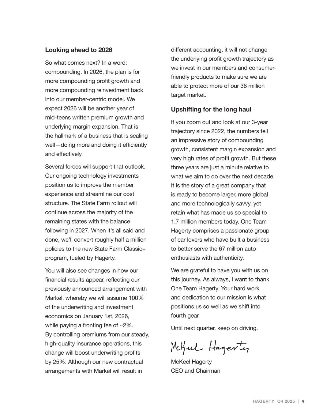 Looking ahead to 2026 So what comes next? In a word: compounding. In 2026, the plan is for more compounding profit growth and more compounding reinvestment back into our member-centric model. We expect 2026 will be another year of mid-teens written premium growth and underlying margin expansion. That is the hallmark of a business that is scaling well—doing more and doing it efficiently and effectively. Several forces will support that outlook. Our ongoing technology investments position us to improve the member experience and streamline our cost structure. The State Farm rollout will continue across the majority of the remaining states with the balance following in 2027. When it’s all said and done, we’ll convert roughly half a million policies to the new State Farm Classic+ program, fueled by Hagerty. You will also see changes in how our financial results appear, reflecting our previously announced arrangement with Markel, whereby we will assume 100% of the underwriting and investment economics on January 1st, 2026, while paying a fronting fee of ~2%. By controlling premiums from our steady, high-quality insurance operations, this change will boost underwriting profits by 25%. Although our new contractual arrangements with Markel will result in different accounting, it will not change the underlying profit growth trajectory as we invest in our members and consumer- friendly products to make sure we are able to protect more of our 36 million target market. Upshifting for the long haul If you zoom out and look at our 3-year trajectory since 2022, the numbers tell an impressive story of compounding growth, consistent margin expansion and very high rates of profit growth. But these three years are just a minute relative to what we aim to do over the next decade. It is the story of a great company that is ready to become larger, more global and more technologically savvy, yet retain what has made us so special to 1.7 million members today. One Team Hagerty comprises a passionate group of car lovers who have built a business to better serve the 67 million auto enthusiasts with authenticity. We are grateful to have you with us on this journey. As always, I want to thank One Team Hagerty. Your hard work and dedication to our mission is what positions us so well as we shift into fourth gear. Until next quarter, keep on driving. McKeel Hagerty CEO and Chairman HAGERTY Q4 2025 | 4