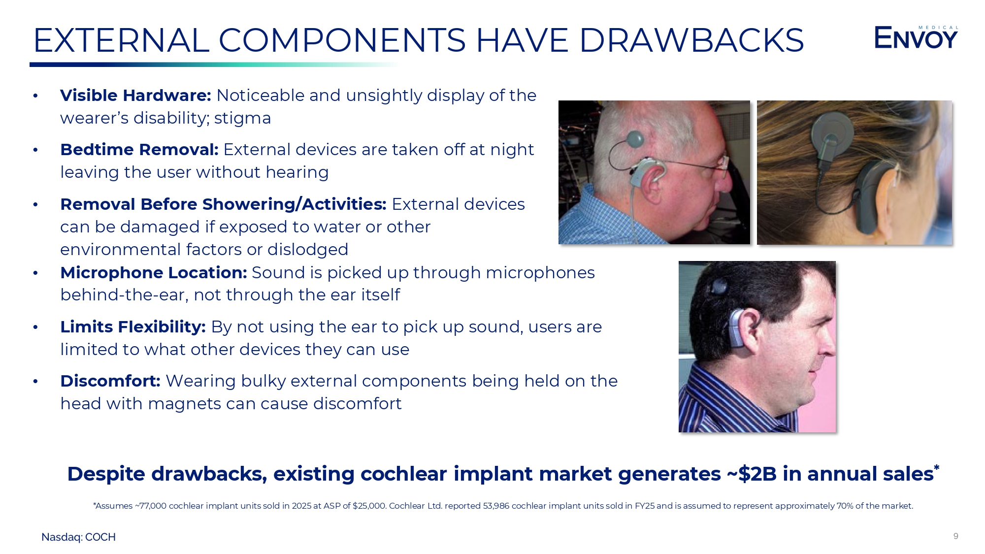 Nasdaq: COCH 8 TRADITIONAL COCHLEAR IMPLANTS For illustrative purposes only. Experience and results may vary. Sound processor (External) • Picks up sound through off - ear or behind - the - ear microphone(s) • Processes sound into digital information • Contains battery • Does not use natural hearing pathway (i.e., function of Outer Ear, Ear Canal, Ear Drum, and Middle Ear are bypassed) Implant (Internal) • Receives signal and transmits electrical stimulation to the cochlea through electrode array Cochlea Ear Drum Traditional cochlear implants require bulky external components to provide patient with perception of sound – without external wearable components the device does not work Magnets • Two magnets – one in the sound processor and one in the implant – keep the components aligned Natural Hearing Pathway