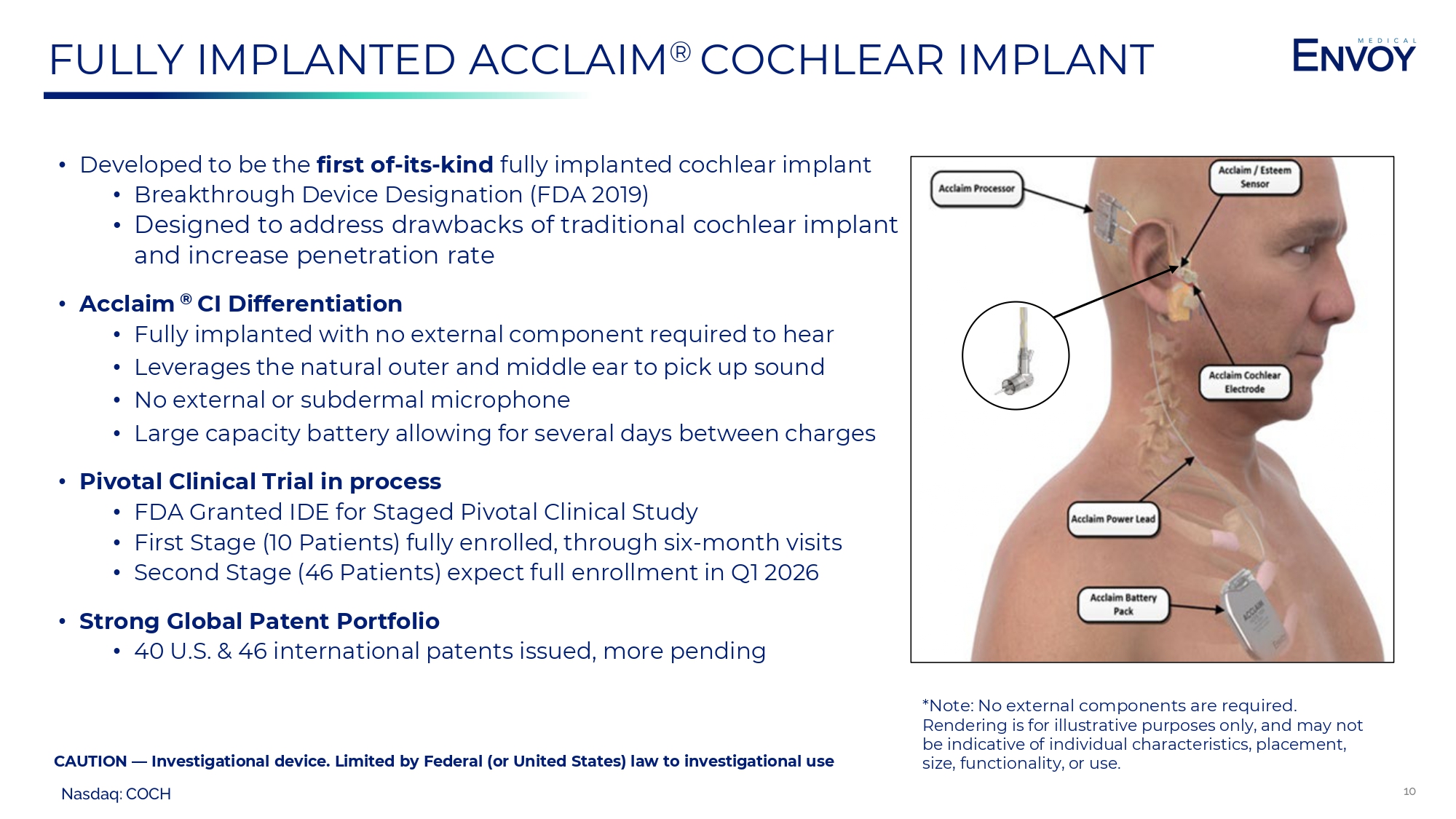 Nasdaq: COCH 18 ACCLAIM ® COCHLEAR IMPLANT PIVOTAL TRIAL Pivotal Clinical Trial Evaluating Safety & Efficacy of the Fully Implanted Acclaim® Cochlear Implant (CI) ClinicalTrials.gov ID# NCT06699797 Trial Objective: Ability to safely and effectively treat severe to profound sensorineural hearing loss in adults Trial Sites: 7; Subjects: 56; Reported Progress: 23 Implants Completed as of December 12 th 2025 Anticipated Enrollment Completion (subjects implanted): Q1 2026 Protocol: Acclaim® CI implanted; clinic visits at 1 - , 3 - , and 6 - months, and 1 - yr after device activation Primary Effectiveness Endpoint: Within - subject difference between the CNC Word Score obtained at 12 - months post - activation of Acclaim® and the pre - operative aided score in the ear to be implanted Primary Safety Endpoint: Frequency and severity of device - related and procedure - related adverse events reported through 12 - Months post activation Note: No required comparison to other approved devices or technologies. Patient is their own control. CAUTION — Investigational device. Limited by Federal (or United States) law to investigational use