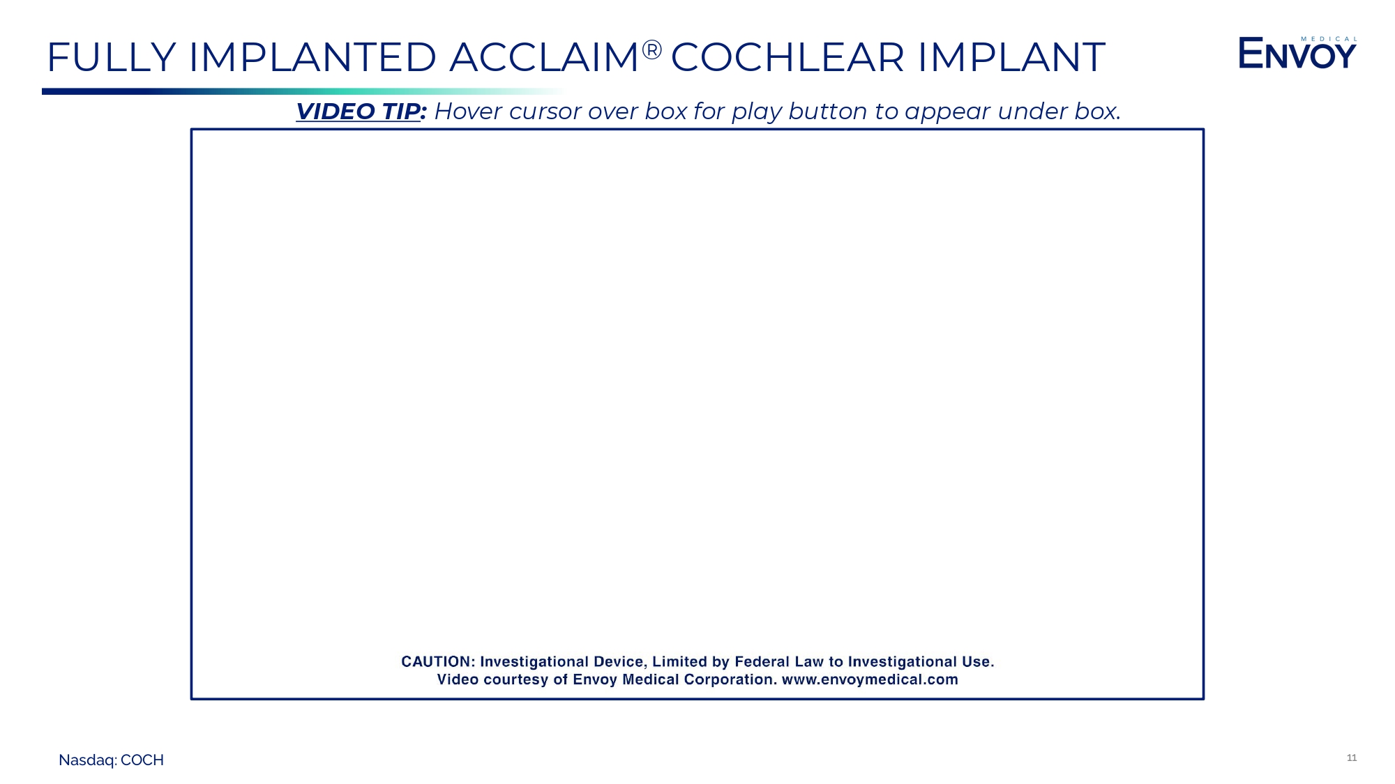 Nasdaq: COCH 11 FULLY IMPLANTED ACCLAIM ® COCHLEAR IMPLANT VIDEO TIP : Hover cursor over box for play button to appear under box.