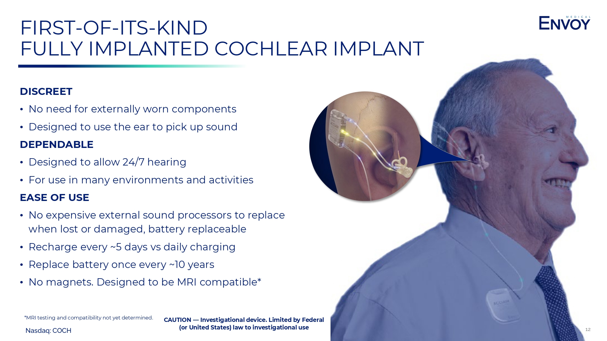Nasdaq: COCH 12 FIRST - OF - ITS - KIND FULLY IMPLANTED COCHLEAR IMPLANT DISCREET • No need for externally worn components • Designed to use the ear to pick up sound DEPENDABLE • Designed to allow 24/7 hearing • For use in many environments and activities EASE OF USE • No expensive external sound processors to replace when lost or damaged, battery replaceable • Recharge every ~5 days vs daily charging • Replace battery once every ~10 years • No magnets. Designed to be MRI compatible* *MRI testing and compatibility not yet determined. CAUTION — Investigational device. Limited by Federal (or United States) law to investigational use