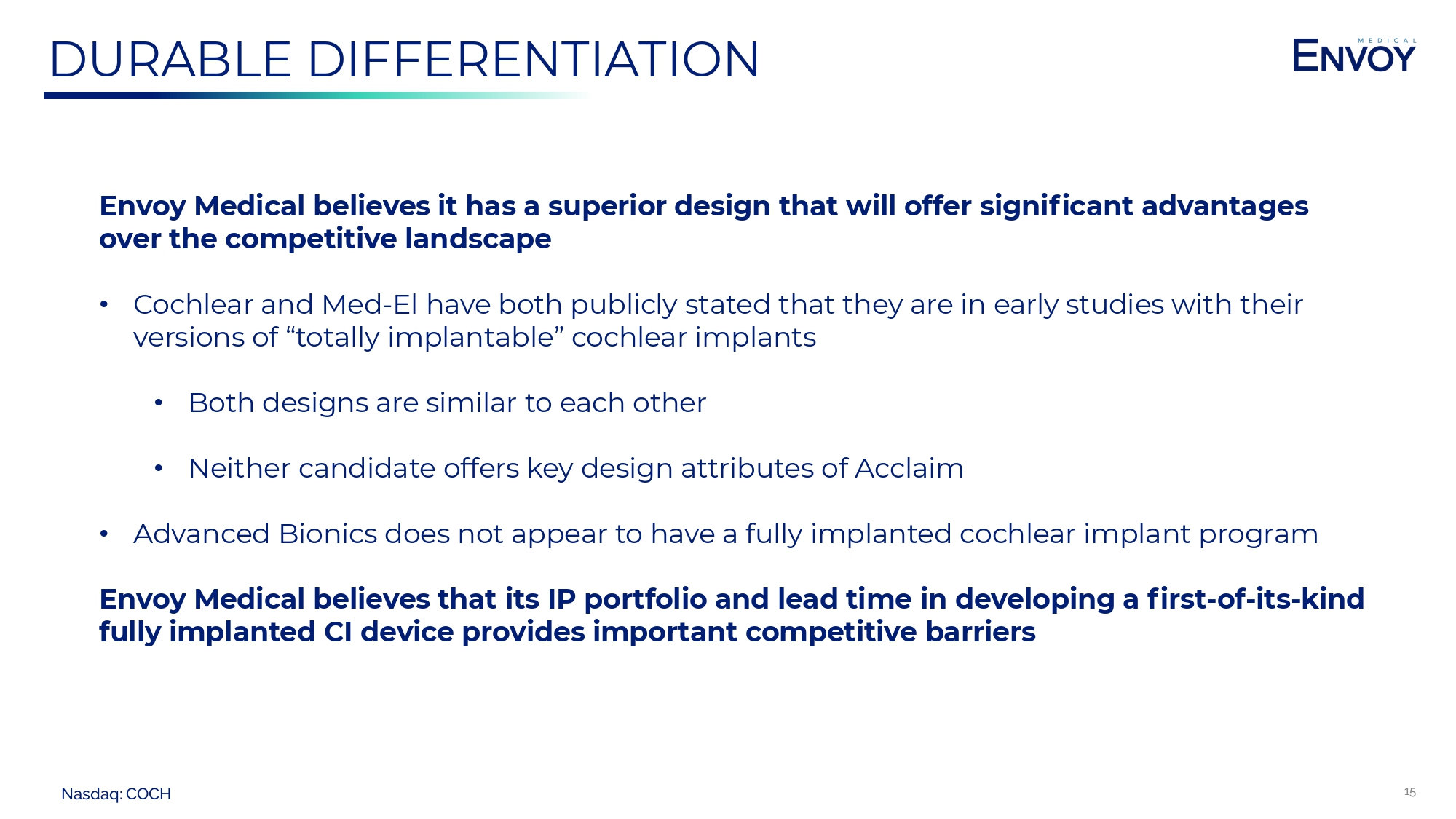 Nasdaq: COCH 14 THE RACE TO FULLY IMPLANTED CIs X • • • Feasibility Study on Record X x x • Breakthrough Device Designation from U.S. FDA for Fully Implanted Cochlear Implant X ? ? • Investigational Device Exemption (IDE) application approved by FDA to begin Pivotal Clinical Trial in US. x ? ? • Enrollment of Pivotal Clinical Trial underway. x x x x FDA Approval for Commercial Sales in U.S. part of (USA) (Europe) (Australia) SOURCE: Envoy Medical management *. Third party logos and brands are property of their respective owners. Shown for illustrative purposes only