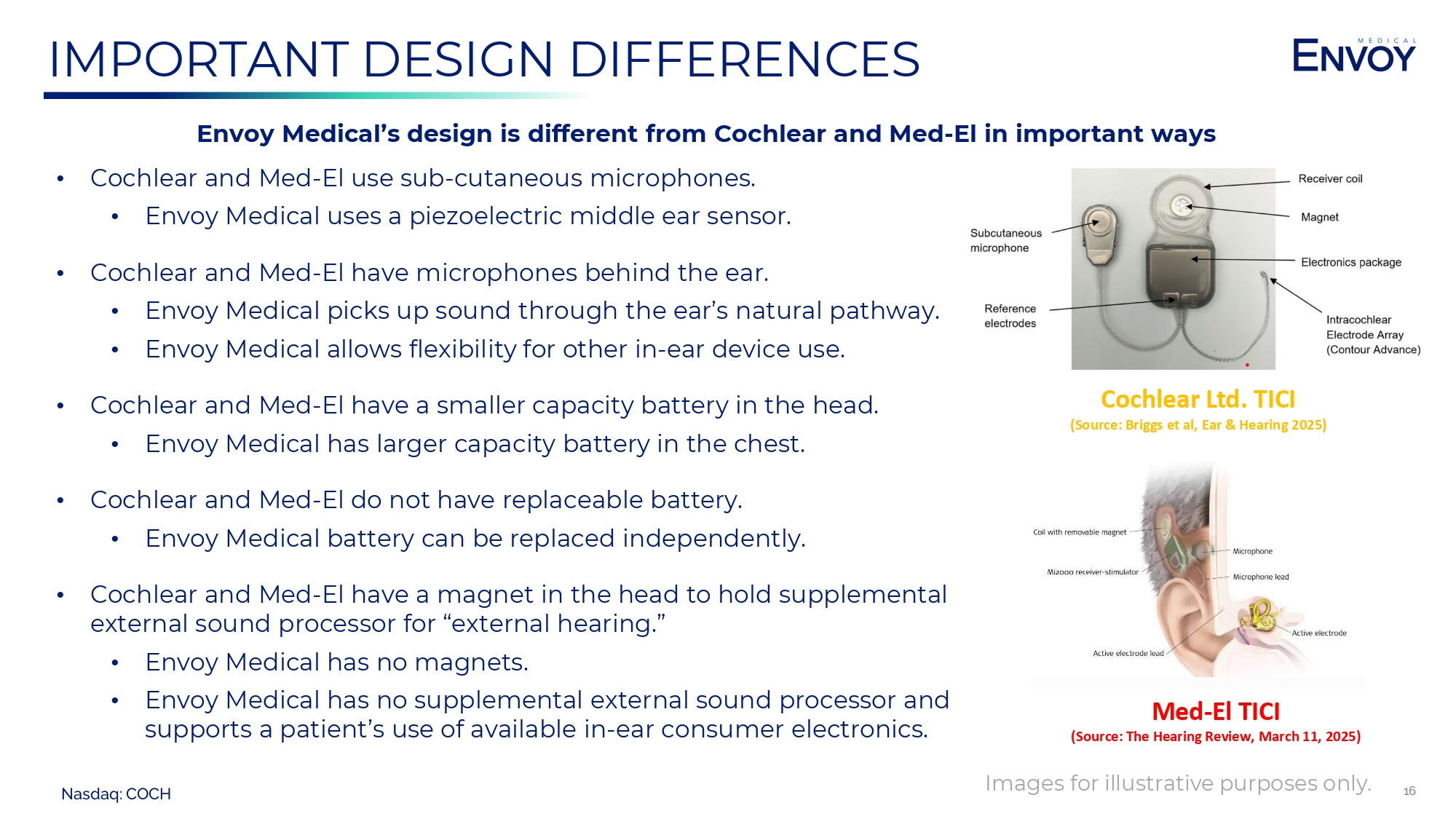 Nasdaq: COCH 16 IMPORTANT DESIGN DIFFERENCES • Cochlear and Med - El use sub - cutaneous microphones. • Envoy Medical uses a piezoelectric middle ear sensor. • Cochlear and Med - El have microphones behind the ear. • Envoy Medical picks up sound through the ear’s natural pathway. • Envoy Medical allows flexibility for other in - ear device use. • Cochlear and Med - El have a smaller capacity battery in the head. • Envoy Medical has larger capacity battery in the chest. • Cochlear and Med - El do not have replaceable battery. • Envoy Medical battery can be replaced independently. • Cochlear and Med - El have a magnet in the head to hold supplemental external sound processor for “external hearing.” • Envoy Medical has no magnets. • Envoy Medical has no supplemental external sound processor and supports a patient’s use of available in - ear consumer electronics. Cochlear Ltd. TICI (Source: Briggs et al, Ear & Hearing 2025) Med - El TICI (Source: The Hearing Review, March 11, 2025) Envoy Medical’s design is different from Cochlear and Med - El in important ways Images for illustrative purposes only.