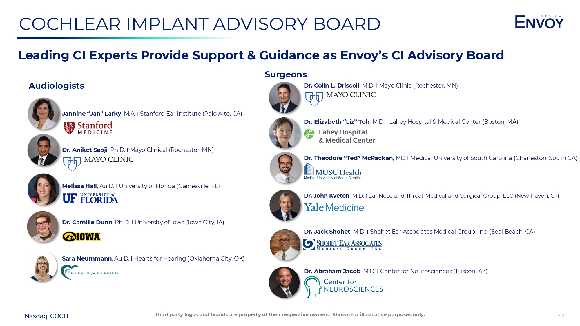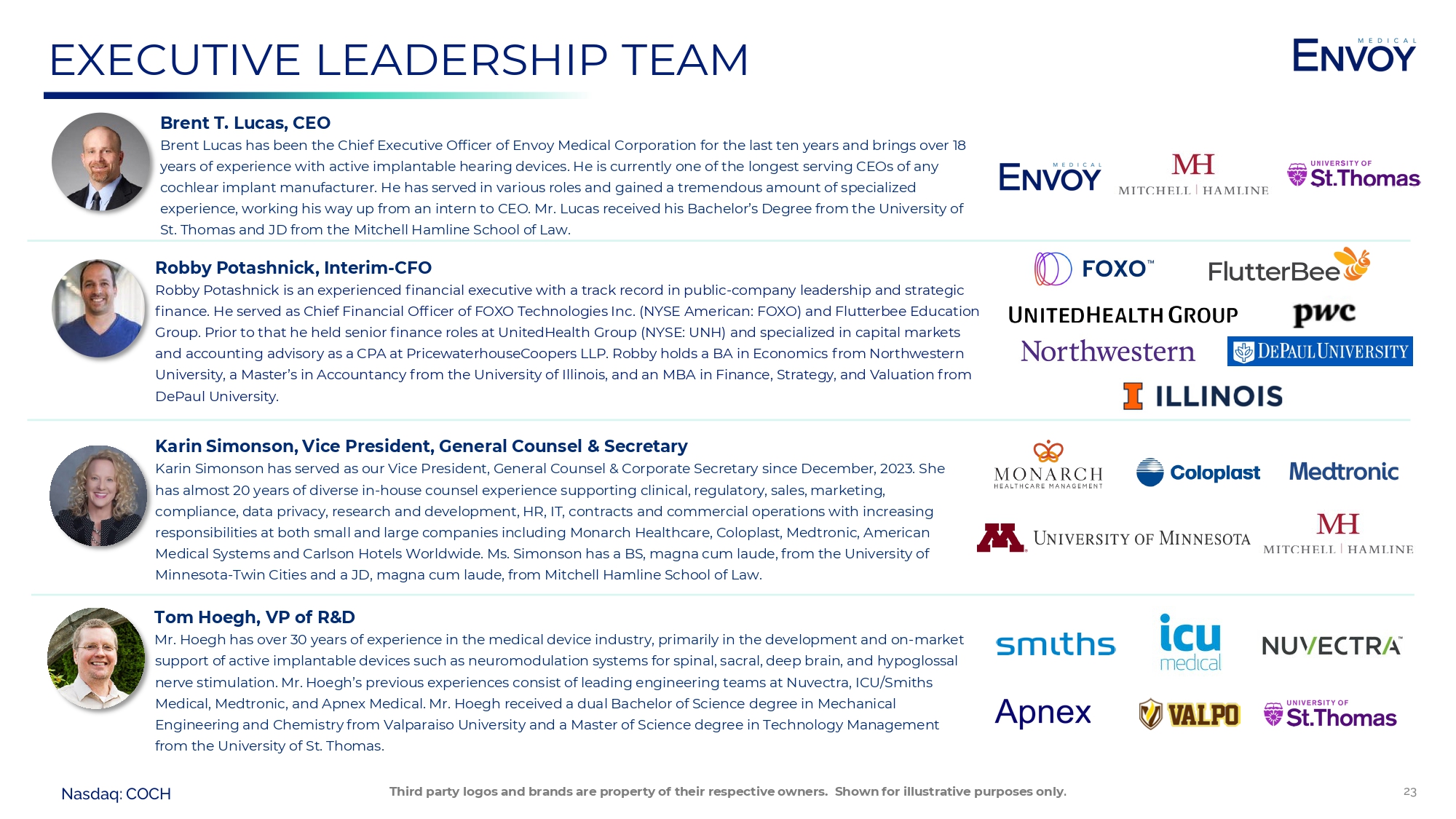Nasdaq: COCH 23 EXECUTIVE LEADERSHIP TEAM Brent T. Lucas, CEO Brent Lucas has been the Chief Executive Officer of Envoy Medical Corporation for the last ten years and brings over 18 years of experience with active implantable hearing devices. He is currently one of the longest serving CEOs of any cochlear implant manufacturer. He has served in various roles and gained a tremendous amount of specialized experience, working his way up from an intern to CEO. Mr. Lucas received his Bachelor’s Degree from the University of St. Thomas and JD from the Mitchell Hamline School of Law. Tom Hoegh , VP of R&D Mr. Hoegh has over 30 years of experience in the medical device industry, primarily in the development and on - market support of active implantable devices such as neuromodulation systems for spinal, sacral, deep brain, and hypoglossal nerve stimulation. Mr. Hoegh’s previous experiences consist of leading engineering teams at Nuvectra , ICU/Smiths Medical, Medtronic, and Apnex Medical. Mr. Hoegh received a dual Bachelor of Science degree in Mechanical Engineering and Chemistry from Valparaiso University and a Master of Science degree in Technology Management from the University of St. Thomas. Karin Simonson, Vice President, General Counsel & Secretary Karin Simonson has served as our Vice President, General Counsel & Corporate Secretary since December, 2023. She has almost 20 years of diverse in - house counsel experience supporting clinical, regulatory, sales, marketing, compliance, data privacy, research and development, HR, IT, contracts and commercial operations with increasing responsibilities at both small and large companies including Monarch Healthcare, Coloplast, Medtronic, American Medical Systems and Carlson Hotels Worldwide. Ms. Simonson has a BS, magna cum laude, from the University of Minnesota - Twin Cities and a JD, magna cum laude, from Mitchell Hamline School of Law. Third party logos and brands are property of their respective owners. Shown for illustrative purposes only . Robby Potashnick, Interim - CFO Robby Potashnick is an experienced financial executive with a track record in public - company leadership and strategic finance. He served as Chief Financial Officer of FOXO Technologies Inc. (NYSE American: FOXO) and Flutterbee Education Group. Prior to that he held senior finance roles at UnitedHealth Group (NYSE: UNH) and specialized in capital markets and accounting advisory as a CPA at PricewaterhouseCoopers LLP. Robby holds a BA in Economics from Northwestern University, a Master’s in Accountancy from the University of Illinois, and an MBA in Finance, Strategy, and Valuation from DePaul University.