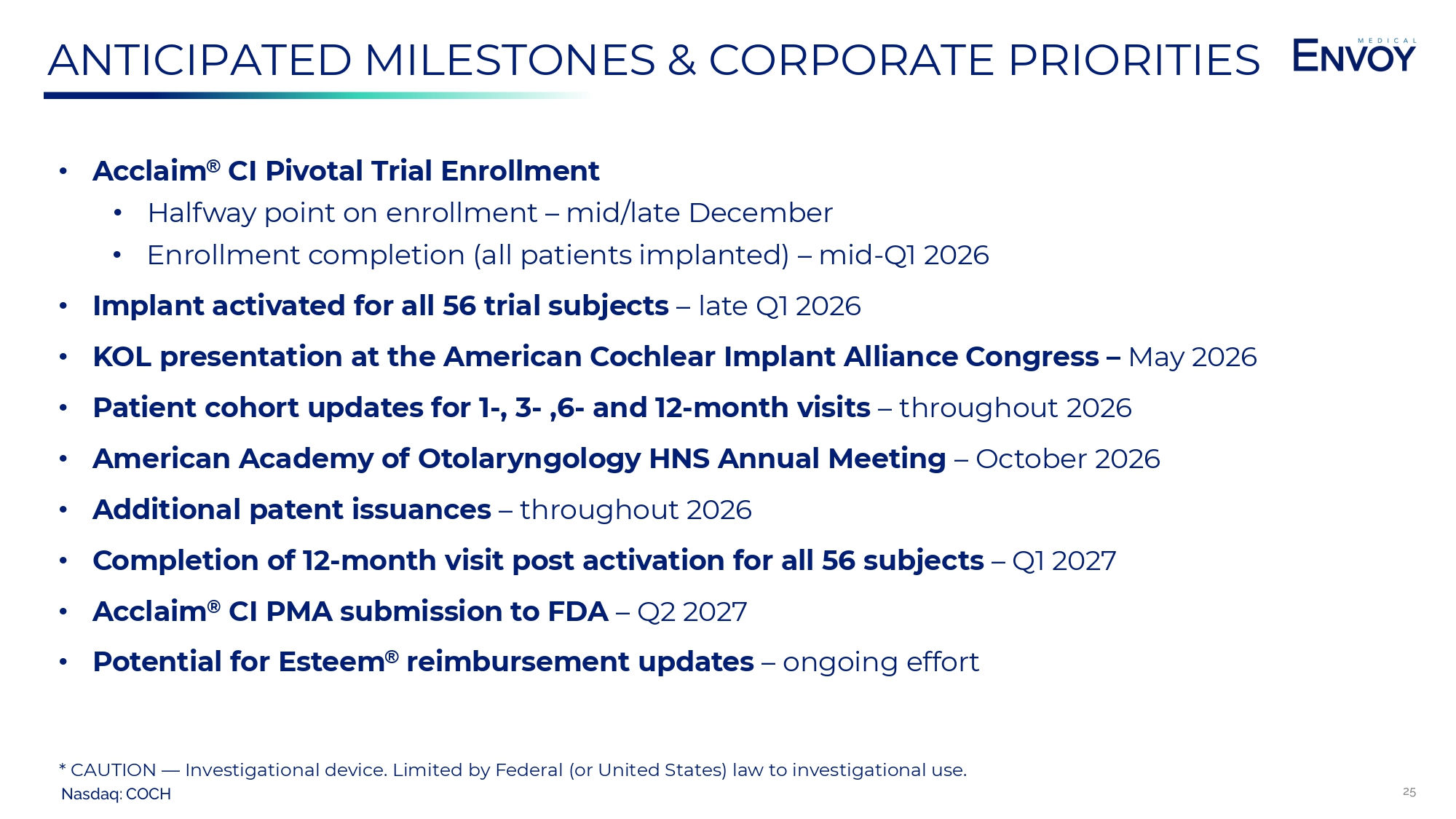 Nasdaq: COCH 25 ANTICIPATED MILESTONES & CORPORATE PRIORITIES ‡ ƬƬǼƏǣȅ Š !X ¨ǣɮȒɎƏǼ ÁȸǣƏǼ 0ȇȸȒǼǼȅƺȇɎ ‡ RƏǼǔɯƏɵ ȵȒǣȇɎ Ȓȇ ƺȇȸȒǼǼȅƺȇɎ ٫ ȅǣƳٖǼƏɎƺ (ƺƬƺȅƫƺȸ ‡ 0ȇȸȒǼǼȅƺȇɎ ƬȒȅȵǼƺɎǣȒȇ ٢ƏǼǼ ȵƏɎǣƺȇɎɀ ǣȅȵǼƏȇɎƺƳ٣ ٫ ȅǣƳ ٮ ª אאה ‡ XȅȵǼƏȇɎ ƏƬɎǣɮƏɎƺƳ ǔȒȸ ƏǼǼ דה ɎȸǣƏǼ ɀɖƫǴƺƬɎɀ ٫ ǼƏɎƺ ª אאה ‡ k…n ȵȸƺɀƺȇɎƏɎǣȒȇ ƏɎ Ɏǝƺ ȅƺȸǣƬƏȇ !ȒƬǝǼƺƏȸ XȅȵǼƏȇɎ ǼǼǣƏȇƬƺ !ȒȇǕȸƺɀɀ ٫ xƏɵ אאה ‡ ¨ƏɎǣƺȇɎ ƬȒǝȒȸɎ ɖȵƳƏɎƺɀ ǔȒȸ ٮ ً ב ٮ ً ה ٮ ƏȇƳ א ٮ ȅȒȇɎǝ ɮǣɀǣɎɀ ٫ ɎǝȸȒɖǕǝȒɖɎ אאה ‡ ȅƺȸǣƬƏȇ ƬƏƳƺȅɵ Ȓǔ …ɎȒǼƏȸɵȇǕȒǼȒǕɵ Rz³ ȇȇɖƏǼ xƺƺɎǣȇǕ ٫ …ƬɎȒƫƺȸ אאה ‡ ƳƳǣɎǣȒȇƏǼ ȵƏɎƺȇɎ ǣɀɀɖƏȇƬƺɀ ٫ ɎǝȸȒɖǕǝȒɖɎ אאה ‡ !ȒȅȵǼƺɎǣȒȇ Ȓǔ א ٮ ȅȒȇɎǝ ɮǣɀǣɎ ȵȒɀɎ ƏƬɎǣɮƏɎǣȒȇ ǔȒȸ ƏǼǼ דה ɀɖƫǴƺƬɎɀ ٫ ª אאו ‡ ƬƬǼƏǣȅ ۱ !X ¨x ɀɖƫȅǣɀɀǣȒȇ ɎȒ I( ٫ ª א אאו ‡ ¨ȒɎƺȇɎǣƏǼ ǔȒȸ 0ɀɎƺƺȅ Š ȸƺǣȅƫɖȸɀƺȅƺȇɎ ɖȵƳƏɎƺɀ ٫ ȒȇǕȒǣȇǕ ƺǔǔȒȸɎ * CAUTION — Investigational device. Limited by Federal (or United States) law to investigational use.