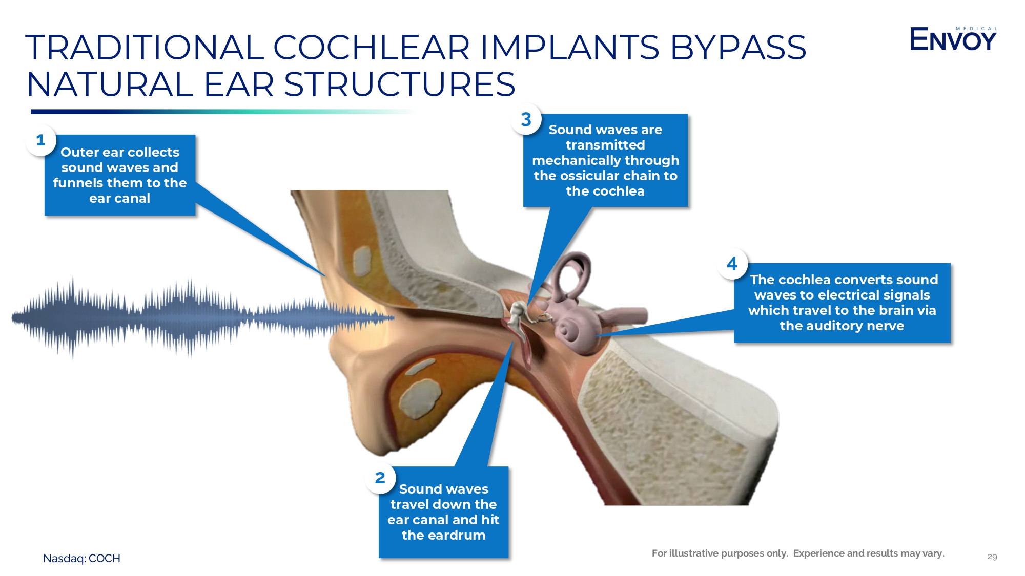 Nasdaq: COCH 2 FORWARD LOOKING STATEMENTS This presentation includes “forward - looking statements” within the meaning of the “safe harbor” provisions of the United States Private Securities Litigation Reform Act of 1995. Forward - Looking statements may be identified by the use of words such as “estimate,” “plan,” “project,” “forecast,” “intend,” “will,” “expect,” “anticipate,” “believe,” “seek,” “target” or other sim ila r expressions that predict or indicate future events or trends or that are not statements of historical matters, but the abse nce of these words does not mean that a statement is not forward - looking. Such statements may include, but are not limited to, statements reg arding the expectations of Envoy Medical concerning the outlook for its business, productivity, plans and goals for future operational improvements and capital investments; the timing and results of IRB approvals, site documents, logistics or activ ati ons, enrollments, follow - up visits, data, and clinical trials of the Acclaim CI, and the participation or any changes in participation of any subjects, institutions or healthcare professionals in such trials; the Acclaim CI being the first to mar ket fully implanted cochlear implant; the safety, performance, and market acceptance of the Acclaim CI; future market conditions or economic performance and developments in the capital and credit markets; the effect of proposed legislation on Medicare and i nsu rance reimbursement for the Esteem device and the impact of any such change to reimbursement policy on the business and financial results of Envoy Medical, and any information concerning possible or assumed future operations of Envo y M edical. The forward - looking statements contained in this Presentation reflect Envoy Medical’s current views about future events and are subject to numerous known and unknown risks, uncertainties, assumptions and changes in circumstances that may cau se its actual results to differ significantly from those expressed in any forward - looking statement. Envoy Medical does not guarantee that the events described will happen as described (or that they will happen at all). These forward - looking statem ents are subject to a number of risks and uncertainties, including, but not limited to changes in the market price of shares of Envoy Medical’s Class A Common Stock; changes in or removal of Envoy Medical’s shares inclusion in any index; Envoy Medical’s su ccess in retaining or recruiting, or changes required in, its officers, key employees or directors; unpredictability in the medical device industry, the regulatory process to approve medical devices, and the clinical development process of Envoy Med ica l products; competition in the medical device industry, and the failure to introduce new products and services in a timely manner or at competitive prices to compete successfully against competitors; disruptions in relationships with Envoy Medical’ s s uppliers, or disruptions in Envoy Medical’s own production capabilities for some of the key components and materials of its products; changes in the need for capital and the availability of financing and capital to fund these needs; changes in inter est rates or rates of inflation; legal, regulatory and other proceedings could be costly and time - consuming to defend; changes in applicable laws or regulations, or the application thereof on Envoy Medical; a loss of any of Envoy Medical’s key intellectua l p roperty rights or failure to adequately protect intellectual property rights; the effects of catastrophic events, including w ar, terrorism and other international conflicts; and other risks and uncertainties set forth in the section entitled “Risk Factor s” and “Cautionary Note Regarding Forward Looking Statements” in the Annual Report on Form 10 - K filed by Envoy Medical on March 31, 2025, and in other reports Envoy Medical files, with the SEC. If any of these risks materialize or Envoy Medical’s assump tio ns prove incorrect, actual results could differ materially from the results implied by these forward - looking statements. While forward - looking statements reflect Envoy Medical’s good faith beliefs, they are not guarantees of future performance. Envoy Medi cal disclaims any obligation to publicly update or revise any forward - looking statement to reflect changes in underlying assumptions or factors, new information, data or methods, future events or other changes after the date of this presentation, ex cept as required by applicable law. You should not place undue reliance on any forward - looking statements, which are based only on information currently available to Envoy Medical. No representations or warranties expressed or implied are given in, or in respect of, this Presentation. Industry and market dat a used in this Presentation have been obtained from third - party industry publication and sources as well as from research reports prepared for other purposes. Envoy Medical has not independently verified the data contained from these sources and c ann ot assure you of the data’s accuracy or completeness. This data is subject to change. Recipients of this Presentation are not to constitute its contents, or any prior or subsequent communications from or with Envoy or its representatives as invest men t, legal or tax advice. In addition, this Presentation does not purport to be all - inclusive or to contain all of the information that may be required to make a full analysis of Envoy Medical. Recipients of this Presentation should each make their own evaluati on of Envoy Medical and of the relevance and adequacy of the information and should make such other investigations as they deem necessary. Market, ranking and industry data used throughout this Presentation, including statements regarding market size, are based on in dustry sources and the good faith estimates of Envoy’s manageme