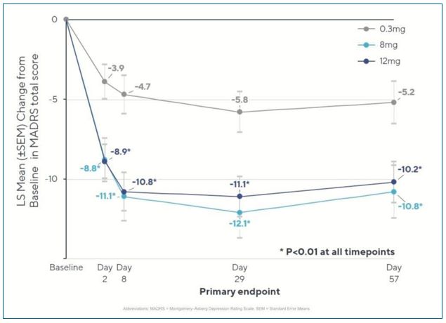 Both 8 mg and 12 mg single doses of BPL-003 showed statistically significant and clinically meaningful reductions in depressive symptoms at all time points of the study compared to a 0.3 mg low-dose active control