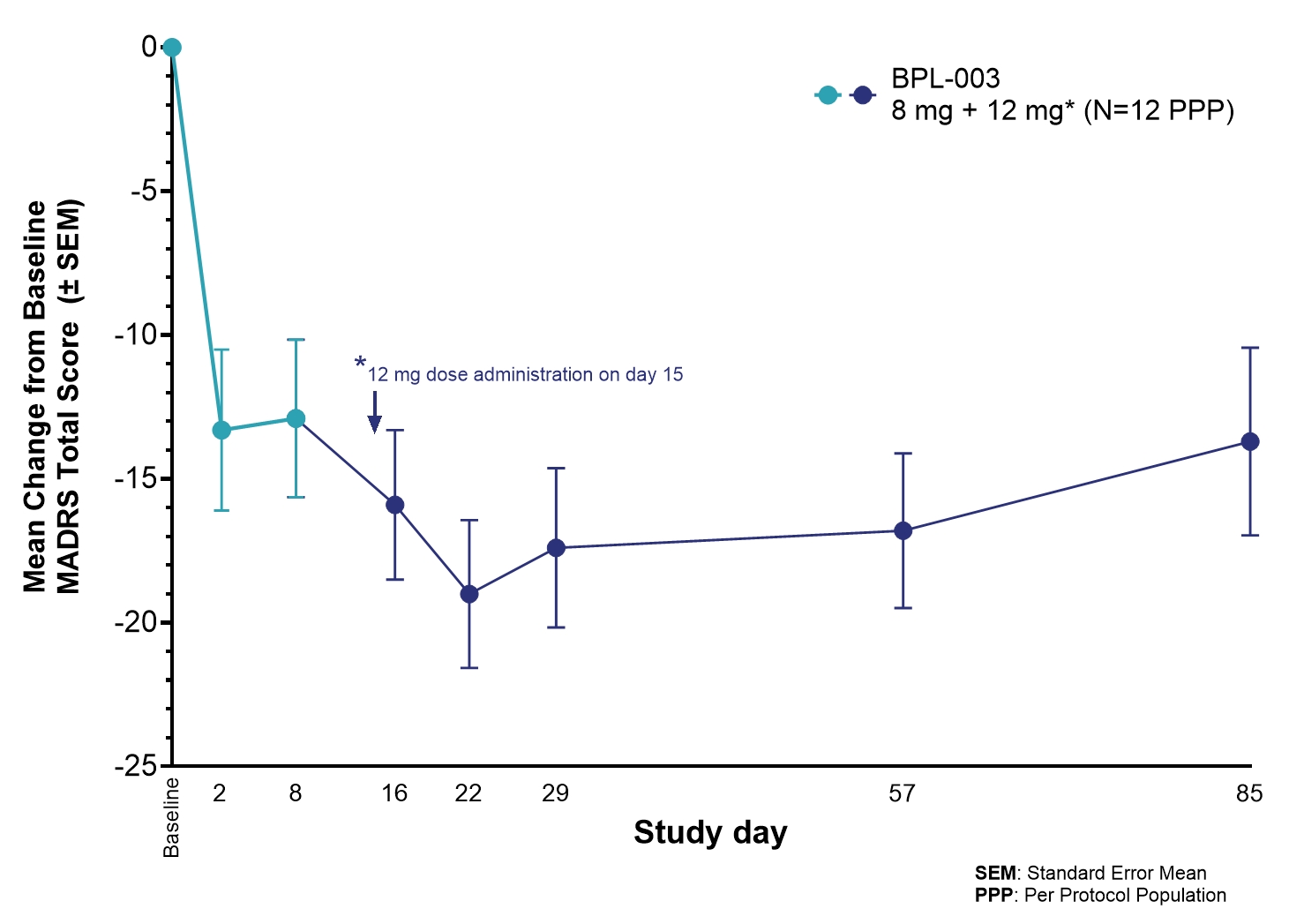 on concurrent antidepressants, and 12 met the criteria for per-protocol analysis. Patients were given an 8 mg dose of BPL-003 followed by a 12 mg dose two weeks later. Safety, tolerability and efficacy assessments were conducted at various