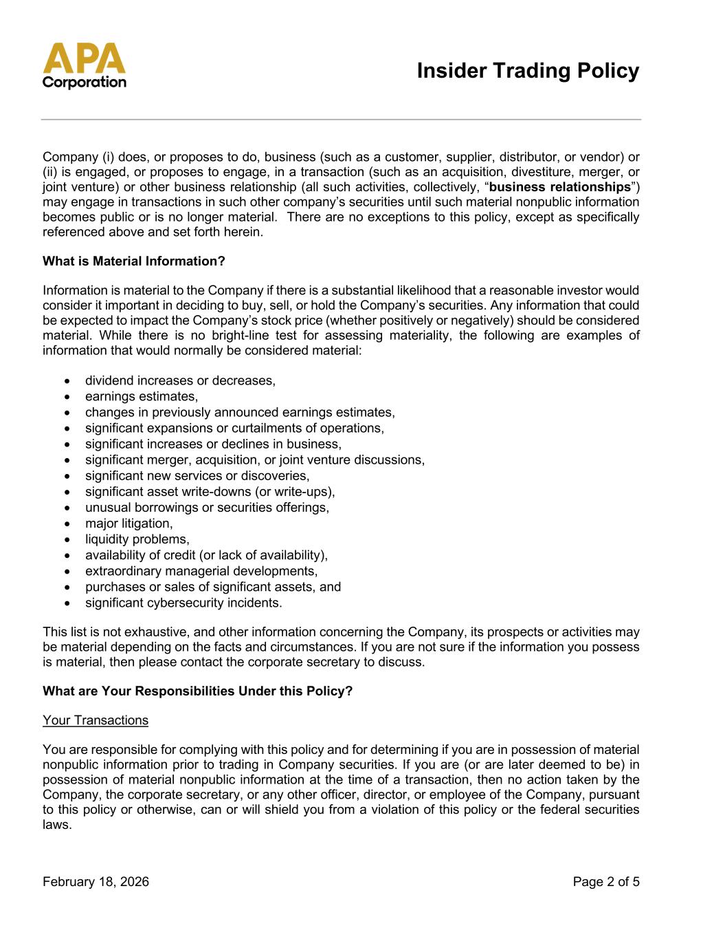 Insider Trading Policy February 18, 2026 Page 1 of 5 Exhibit 19.1 This Insider Trading Policy (this “policy”) applies to (i) all officers, directors, and employees of APA Corporation and its subsidiaries and affiliates worldwide (collectively, the “Company”), (ii) all contractors, consultants, agents, and advisors of the Company, (iii) all other persons and entities who may from time to time have access to the Company’s material nonpublic information (information that has a substantial likelihood that a reasonable investor would consider it important in deciding to buy, sell, or hold the Company’s securities and that has not been widely disseminated, such as through a press release or other public disclosure) and are designated by the Company as being subject to this policy (such persons and entities, collectively with the persons identified in clauses (i) and (ii) above, the “Covered Persons”), and (iv) all family members of, persons sharing the household of, and entities controlled by a Covered Person (such family members, other persons, and entities, collectively, the “Related Persons”). The insider trading and other anti-fraud provisions of the federal securities laws restrict your ability to trade in Company securities while you are in possession of material nonpublic information that you acquire in the course of working for the Company (also referred to as “inside information”). These laws also limit your ability to share inside information with others, including members of your family and your fellow employees. Violations of the federal securities laws can carry severe civil and criminal penalties for the Company and for you personally, so please read this policy carefully. What Transactions are Subject to this Policy? This policy applies to all purchases, sales, and bona fide gifts of Company securities, including the Company’s common stock (“common stock”), options to purchase common stock, and other securities and derivative securities the Company may issue from time to time, including preferred stock, convertible notes, and warrants, as well as any derivative securities issued by third parties that relate to Company securities. Who Administers this Policy? The Company’s office of the corporate secretary is responsible for administering this policy, and the Company’s corporate secretary (including any assistant secretary delegated responsibilities hereunder by the corporate secretary) is responsible for interpretations of and determinations under this policy. Any such determination or interpretation by the corporate secretary shall be final and not subject to further review. What is the Company’s Policy? It is the policy of the Company that no Covered Person who is aware of material nonpublic information about the Company may, directly or indirectly through family members or other Related Persons: • engage in transactions in Company securities, except as expressly permitted under “Are There Exceptions to this Policy?” below; • recommend that others engage in transactions in Company securities; • use such information to his or her advantage; or • disclose such material nonpublic information. It is also the policy of the Company that no Covered Person who, in the course of working for the Company, becomes aware of material nonpublic information about another company with which the