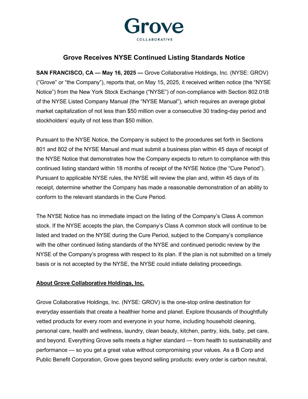 Grove Receives NYSE Continued Listing Standards Notice SAN FRANCISCO, CA — May 16, 2025 — Grove Collaborative Holdings, Inc. (NYSE: GROV) (“Grove” or “the Company”), reports that, on May 15, 2025, it received written notice (the “NYSE Notice”) from the New York Stock Exchange (“NYSE”) of non-compliance with Section 802.01B of the NYSE Listed Company Manual (the “NYSE Manual”), which requires an average global market capitalization of not less than $50 million over a consecutive 30 trading-day period and stockholders’ equity of not less than $50 million. Pursuant to the NYSE Notice, the Company is subject to the procedures set forth in Sections 801 and 802 of the NYSE Manual and must submit a business plan within 45 days of receipt of the NYSE Notice that demonstrates how the Company expects to return to compliance with this continued listing standard within 18 months of receipt of the NYSE Notice (the “Cure Period”). Pursuant to applicable NYSE rules, the NYSE will review the plan and, within 45 days of its receipt, determine whether the Company has made a reasonable demonstration of an ability to conform to the relevant standards in the Cure Period. The NYSE Notice has no immediate impact on the listing of the Company’s Class A common stock. If the NYSE accepts the plan, the Company’s Class A common stock will continue to be listed and traded on the NYSE during the Cure Period, subject to the Company’s compliance with the other continued listing standards of the NYSE and continued periodic review by the NYSE of the Company’s progress with respect to its plan. If the plan is not submitted on a timely basis or is not accepted by the NYSE, the NYSE could initiate delisting proceedings. About Grove Collaborative Holdings, Inc. Grove Collaborative Holdings, Inc. (NYSE: GROV) is the one-stop online destination for everyday essentials that create a healthier home and planet. Explore thousands of thoughtfully vetted products for every room and everyone in your home, including household cleaning, personal care, health and wellness, laundry, clean beauty, kitchen, pantry, kids, baby, pet care, and beyond. Everything Grove sells meets a higher standard — from health to sustainability and performance — so you get a great value without compromising your values. As a B Corp and Public Benefit Corporation, Grove goes beyond selling products: every order is carbon neutral,
