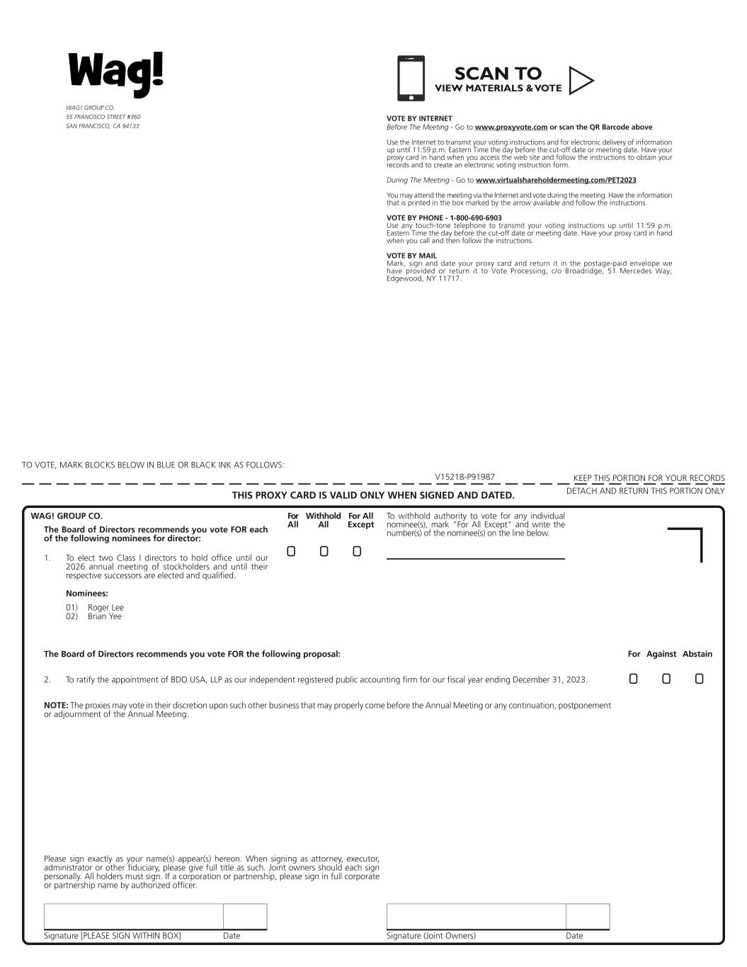 Signature [PLEASE SIGN WITHIN BOX] Date Signature (Joint Owners) Date TO VOTE, MARK BLOCKS BELOW IN BLUE OR BLACK INK AS FOLLOWS: KEEP THIS PORTION FOR YOUR RECORDS DETACH AND RETURN THIS PORTION ONLYTHIS PROXY CARD IS VALID ONLY WHEN SIGNED AND DATED. V15218-P91987 Nominees: 2. To ratify the appointment of BDO USA, LLP as our independent registered public accounting firm for our fiscal year ending December 31, 2023. The Board of Directors recommends you vote FOR the following proposal: NOTE: The proxies may vote in their discretion upon such other business that may properly come before the Annual Meeting or any continuation, postponement or adjournment of the Annual Meeting. Please sign exactly as your name(s) appear(s) hereon. When signing as attorney, executor, administrator or other fiduciary, please give full title as such. Joint owners should each sign personally. All holders must sign. If a corporation or partnership, please sign in full corporate or partnership name by authorized officer. For Against Abstain ! !! WAG! GROUP CO. The Board of Directors recommends you vote FOR each of the following nominees for director: WAG! GROUP CO. 55 FRANCISCO STREET #360 SAN FRANCISCO, CA 94133 1. To elect two Class I directors to hold office until our 2026 annual meeting of stockholders and until their respective successors are elected and qualified. 01) Roger Lee 02) Brian Yee ! ! ! For All Withhold All For All Except To withhold authority to vote for any individual nominee(s), mark "For All Except" and write the number(s) of the nominee(s) on the line below. VOTE BY INTERNET Before The Meeting - Go to www.proxyvote.com or scan the QR Barcode above Use the Internet to transmit your voting instructions and for electronic delivery of information up until 11:59 p.m. Eastern Time the day before the cut-off date or meeting date. Have your proxy card in hand when you access the web site and follow the instructions to obtain your records and to create an electronic voting instruction form. During The Meeting - Go to www.virtualshareholdermeeting.com/PET2023 You may attend the meeting via the Internet and vote during the meeting. Have the information that is printed in the box marked by the arrow available and follow the instructions. VOTE BY PHONE - 1-800-690-6903 Use any touch-tone telephone to transmit your voting instructions up until 11:59 p.m. Eastern Time the day before the cut-off date or meeting date. Have your proxy card in hand when you call and then follow the instructions. VOTE BY MAIL Mark, sign and date your proxy card and return it in the postage-paid envelope we have provided or return it to Vote Processing, c/o Broadridge, 51 Mercedes Way, Edgewood, NY 11717. SCAN TO VIEW MATERIALS & VOTEw