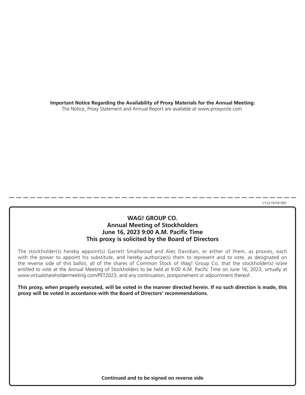 Important Notice Regarding the Availability of Proxy Materials for the Annual Meeting: The Notice, Proxy Statement and Annual Report are available at www.proxyvote.com. V15219-P91987 WAG! GROUP CO. Annual Meeting of Stockholders June 16, 2023 9:00 A.M. Pacific Time This proxy is solicited by the Board of Directors The stockholder(s) hereby appoint(s) Garrett Smallwood and Alec Davidian, or either of them, as proxies, each with the power to appoint his substitute, and hereby authorize(s) them to represent and to vote, as designated on the reverse side of this ballot, all of the shares of Common Stock of Wag! Group Co. that the stockholder(s) is/are entitled to vote at the Annual Meeting of Stockholders to be held at 9:00 A.M. Pacific Time on June 16, 2023, virtually at www.virtualshareholdermeeting.com/PET2023, and any continuation, postponement or adjournment thereof. This proxy, when properly executed, will be voted in the manner directed herein. If no such direction is made, this proxy will be voted in accordance with the Board of Directors' recommendations. Continued and to be signed on reverse side