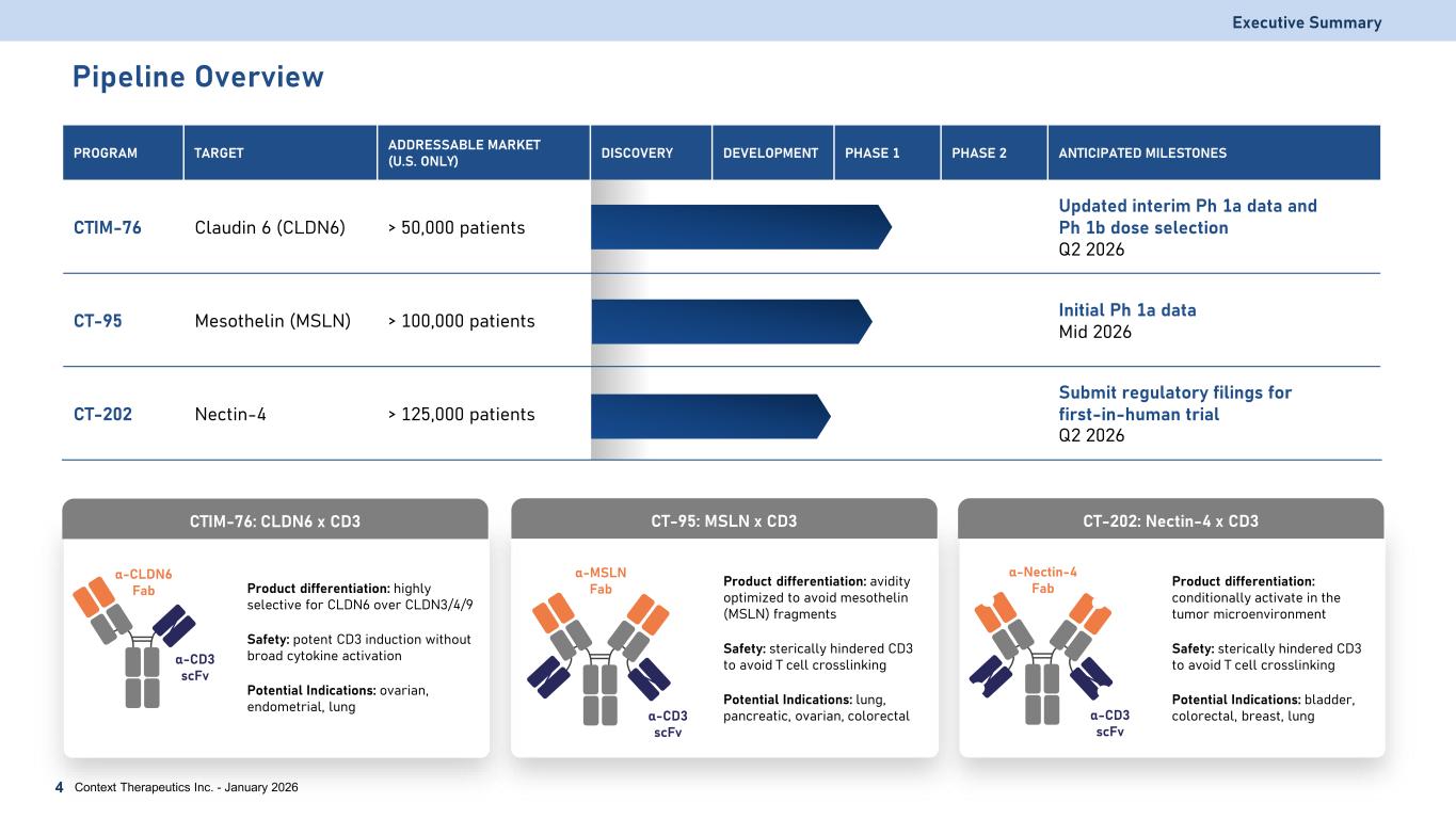 Building a Leading T cell Engager (TCE) Pipeline Executive Summary Context Therapeutics Inc. - January 20263 Strategy Developing potentially best-in-class TCE for solid tumors • Tumor antigens that are clinically validated by antibody drug conjugates (ADC) or chimeric antigen receptor T cell therapy (CAR-T) • Limited or weak competition addressing large market opportunities • High affinity CD3 to maximize solid tumor response Pipeline CTIM-76: Claudin 6 (CLDN6) x CD3 bispecific antibody • CLDN6 is overexpressed in ovarian, endometrial, lung, testicular, and other solid tumors • CTIM-76 was designed to bind selectively to CLDN6 over similar claudin family members, including CLDN3/4/9 CT-95: Mesothelin (MSLN) x CD3 bispecific antibody • MSLN is overexpressed in pancreatic, lung, colorectal, and other solid tumors • CT-95 was designed to bind selectively to membrane-bound MSLN to enhance drug exposure and activity CT-202: Nectin-4 x CD3 bispecific antibody • Nectin-4 is overexpressed in bladder, lung, breast, colorectal, and other solid tumors • CT-202 was designed to be conditionally active within the tumor microenvironment Capitalization Strong financial position with high quality investor base • Expected cash runway into 2027