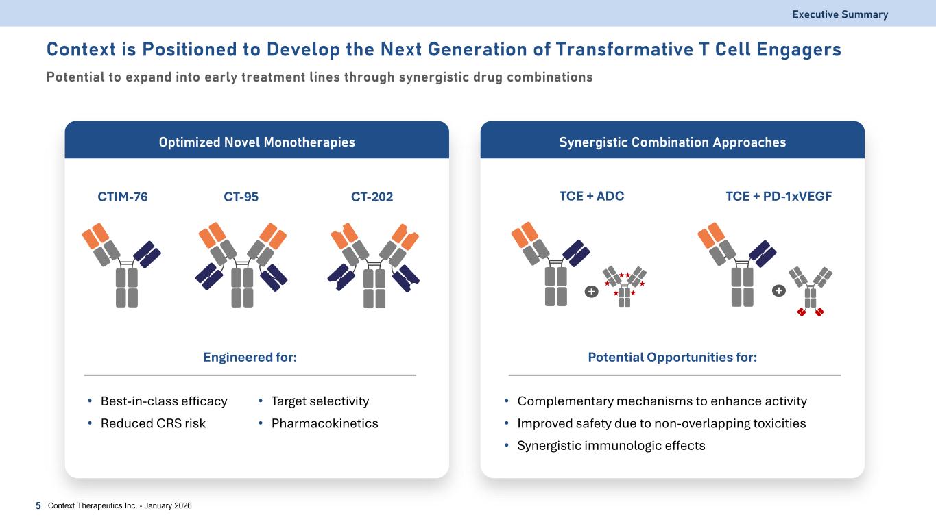 Executive Summary Pipeline Overview Context Therapeutics Inc. - January 20264 PROGRAM TARGET ADDRESSABLE MARKET (U.S. ONLY) DISCOVERY DEVELOPMENT PHASE 1 PHASE 2 ANTICIPATED MILESTONES CTIM-76 Claudin 6 (CLDN6) > 50,000 patients Updated interim Ph 1a data and Ph 1b dose selection Q2 2026 CT-95 Mesothelin (MSLN) > 100,000 patients Initial Ph 1a data Mid 2026 CT-202 Nectin-4 > 125,000 patients Submit regulatory filings for first-in-human trial Q2 2026 CTIM-76: CLDN6 x CD3 CT-95: MSLN x CD3 Product differentiation: highly selective for CLDN6 over CLDN3/4/9 Safety: potent CD3 induction without broad cytokine activation Potential Indications: ovarian, endometrial, lung α-CLDN6 Fab α-CD3 scFv α-MSLN Fab α-CD3 scFv CT-202: Nectin-4 x CD3 Product differentiation: avidity optimized to avoid mesothelin (MSLN) fragments Safety: sterically hindered CD3 to avoid T cell crosslinking Potential Indications: lung, pancreatic, ovarian, colorectal Product differentiation: conditionally activate in the tumor microenvironment Safety: sterically hindered CD3 to avoid T cell crosslinking Potential Indications: bladder, colorectal, breast, lung α-Nectin-4 Fab α-CD3 scFv