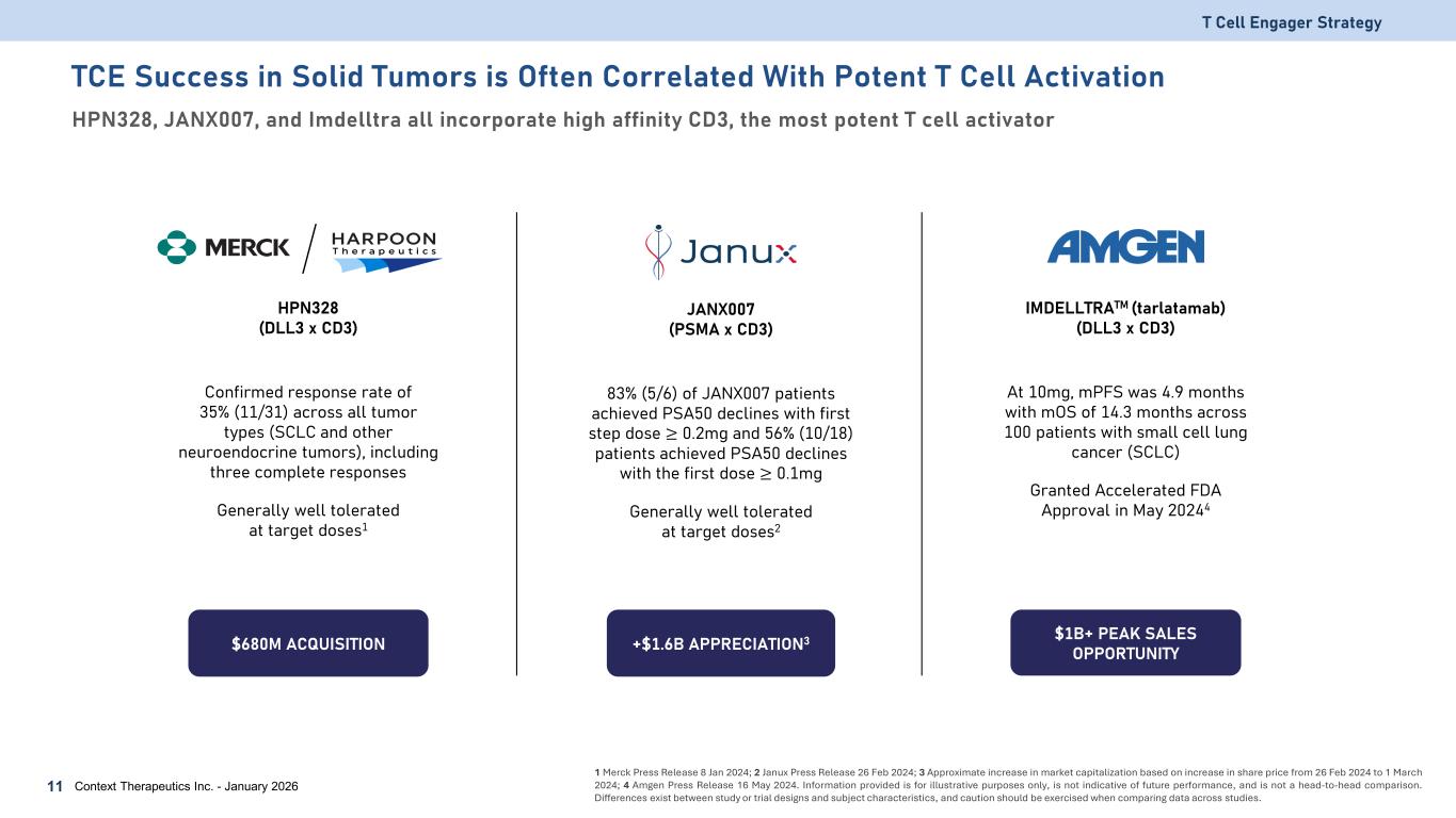 TCE Success in Solid Tumors Asset Tarlatamab (AMG757) HPN328 QLS31905 IBI389 JANX007 JNJ-78278343 Xaluritamig (AMG509) Ubamatamab (REGN4018) Target x Effector DLL3 x CD3 DLL3 x CD3 CLDN18.2 x CD3 CLDN18.2 x CD3 PSMA x CD3 KLK2 x CD3 STEAP1 x CD3 MUC16 x CD3 Cancer Indication Small Cell Lung Small Cell Lung Pancreatic Pancreatic Prostate Prostate Prostate Ovarian Patients (n) 100 73 12 27 16 33 21 13 Efficacy ORR: 40% PFS: 4.9 mos. ORR: 55% DoR: 10.8 mos. ORR: 25% PFS: 3.9 mos. ORR: 38% PSA50: 100% ORR: 50% PFS: 7.5 mos. PSA50: 42% ORR: 8% PFS: 7.9 mos. PSA50: 50% ORR: 20% PFS: 7.8 mos. ORR: 31% Grade ≥ 3 CRS 1% 1% 3% 0% 6% 0% 2% 0% Reference Ahn 2023 ESMO 2025 ASCO 2025 ASCO 2024 15 Nov 2024 data cutoff ASCO 2025 ESMO 2024 ESMO 2022 T Cell Engager Strategy Context Therapeutics Inc. - January 202610 Information provided in the table above as of October 30, 2025. Information provided is for illustrative purposes only and is not a head-to-head comparison. Differences exist between study or trial designs and subject characteristics, and caution should be exercised when comparing data across studies. TCE efficacy in cold tumors with a low rate of cytokine release syndrome (CRS)