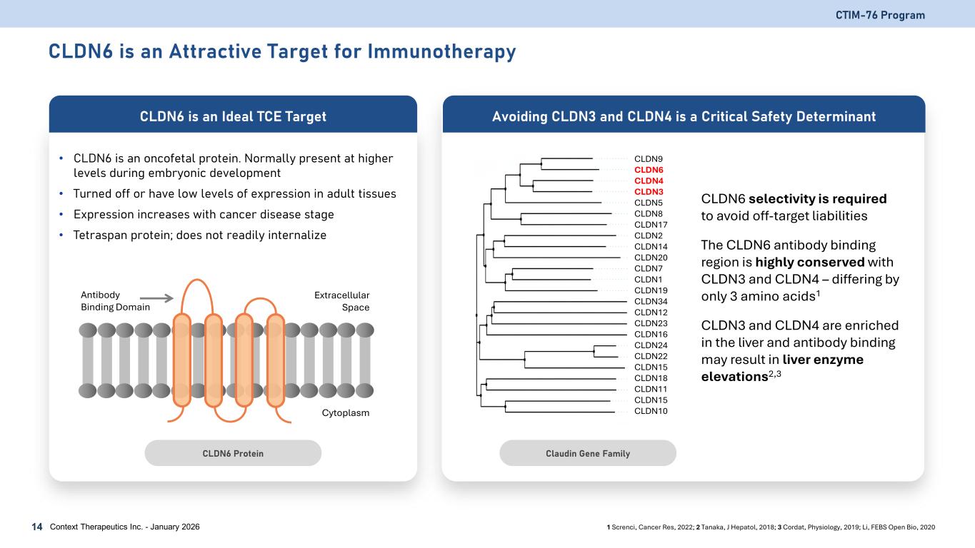 CLDN6 Therapies Have the Potential to Reach a Large Patient Population >50,000 patients per year in the United States in Relapse/Refractory (R/R) Setting CTIM-76 Program 13 Context Therapeutics Inc. - January 2026 Initial indications of interest based on: • CLDN6 prevalence • Patient population size • CLDN6 target validation Selected Cancer indications Incidence (US Only) R/R Incidence CLDN6 Positive CLDN6 Med/High Patient Population Based on R/R Incidence Ovarian 19,900 12,800 75%1 35%1 9,600 Endometrial 65,900 14,000 50%1 22%1 7,140 Testicular 9,910 400 100%3 >95%3 400 Non-Small Cell Lung 201,229 110,653 26%2 6%2 28,769 Colon 152,810 53,010 40%3 0%3 21,204 Breast 290,600 43,800 40%3 0%3 9,417 1 Context internal Phase 1 data; 2 Context internal biopsy prevalence screen data; 3 Mackensen, Nature Medicine, 2023. Incidences based on public estimates; Relapsed/refractory (R/R) or last-line patient population approximated by annual mortality; CLDN6 target prevalence is based on IHC or RNAseq from published reports. Patient population derived from midpoint of CLDN6 positive population multiplied by R/R incident population.