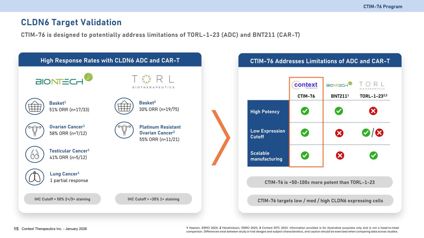 CLDN6 is an Attractive Target for Immunotherapy • CLDN6 is an oncofetal protein. Normally present at higher levels during embryonic development • Turned off or have low levels of expression in adult tissues • Expression increases with cancer disease stage • Tetraspan protein; does not readily internalize CTIM-76 Program Context Therapeutics Inc. - January 202614 CLDN6 is an Ideal TCE Target 1 Screnci, Cancer Res, 2022; 2 Tanaka, J Hepatol, 2018; 3 Cordat, Physiology, 2019; Li, FEBS Open Bio, 2020 CLDN6 selectivity is required to avoid off-target liabilities The CLDN6 antibody binding region is highly conserved with CLDN3 and CLDN4 – differing by only 3 amino acids1 CLDN3 and CLDN4 are enriched in the liver and antibody binding may result in liver enzyme elevations2,3 Avoiding CLDN3 and CLDN4 is a Critical Safety Determinant CLDN6 Protein Claudin Gene Family Extracellular Space Cytoplasm Antibody Binding Domain CLDN9 CLDN6 CLDN4 CLDN3 CLDN5 CLDN8 CLDN17 CLDN2 CLDN14 CLDN20 CLDN7 CLDN1 CLDN19 CLDN34 CLDN12 CLDN23 CLDN16 CLDN24 CLDN22 CLDN15 CLDN18 CLDN11 CLDN15 CLDN10