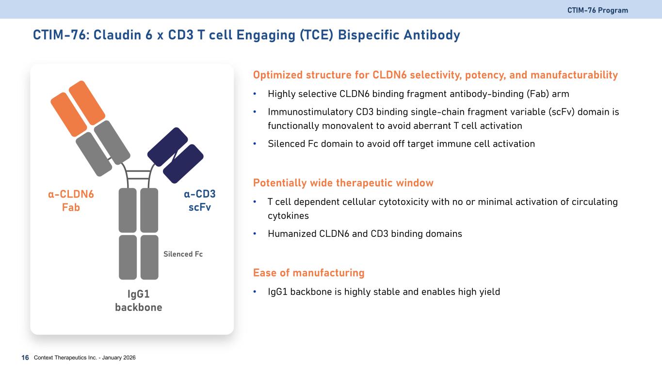 CLDN6 Target Validation CTIM-76 is designed to potentially address limitations of TORL-1-23 (ADC) and BNT211 (CAR-T) CTIM-76 Program Context Therapeutics Inc. - January 202615 CTIM-76 Addresses Limitations of ADC and CAR-THigh Response Rates with CLDN6 ADC and CAR-T CTIM-76 BNT2111 TORL-1-232,3 High Potency Low Expression Cutoff Scalable manufacturing IHC Cutoff = 50% 2+/3+ staining IHC Cutoff = >30% 1+ staining Basket1 51% ORR (n=17/33) Platinum Resistant Ovarian Cancer2 55% ORR (n=11/21) Testicular Cancer1 41% ORR (n=5/12) Ovarian Cancer1 58% ORR (n=7/12) CTIM-76 is ~50-100x more potent than TORL-1-23 CTIM-76 targets low / med / high CLDN6 expressing cells Basket2 30% ORR (n=19/75) Lung Cancer1 1 partial response 1 Haanen, ESMO 2024; 2 Hendrickson, ESMO 2025; 3 Context SITC 2023. Information provided is for illustrative purposes only and is not a head-to-head comparison. Differences exist between study or trial designs and subject characteristics, and caution should be exercised when comparing data across studies.