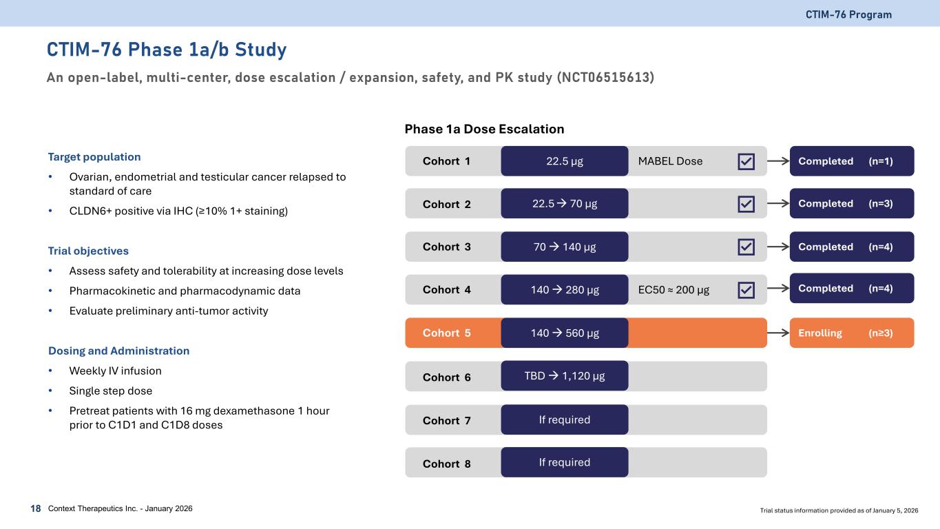CTIM-76 Program CTIM-76 is a Highly Selective and Potent CLDN6 x CD3 Bispecific Antibody Context Therapeutics Inc. - January 202617 Selectivity Potency In Vivo Efficacy • CTIM-76 CLDN6 EC50 of 3.41 nM (binding) • CTIM-76 preferentially binds to CLDN6 over CLDN3/4/9 • CLDN3/4/6/9 were transiently transfected in HEK-293F cells >10,000x • Potency assay provides a better assessment for a TCE bispecific than binding assays for off-target liabilities associated with CLDN3, CLDN4, or CLDN9 • CTIM-76 CLDN6 EC50 of 0.0004 nM (cytotoxicity) • CTIM-76 preferentially targets CLDN6, with minimal binding and cytotoxicity against CLDN9-expressing cells >500x 0 150 300 450 600 0 7 14 21 Tu m or V ol um e (m m 3) Day Vehicle 0.01mg/kg 0.1mg/kg 1.0mg/kg Tumor Regression • CTIM-76 effectively engaged systemically administered human PBMC cells to promote significant tumor regression and complete responses in OVCAR3 (~96,000 CLDN6 copies per cell) ovarian xenograft models in mice • CTIM-76 was well tolerated in OVCAR3 xenograft study • NSG-b2m knockout mice (n=14/arm) engrafted with human PBMCs and bearing advanced subcutaneous OVCAR3 tumor xenografts were treated twice per week