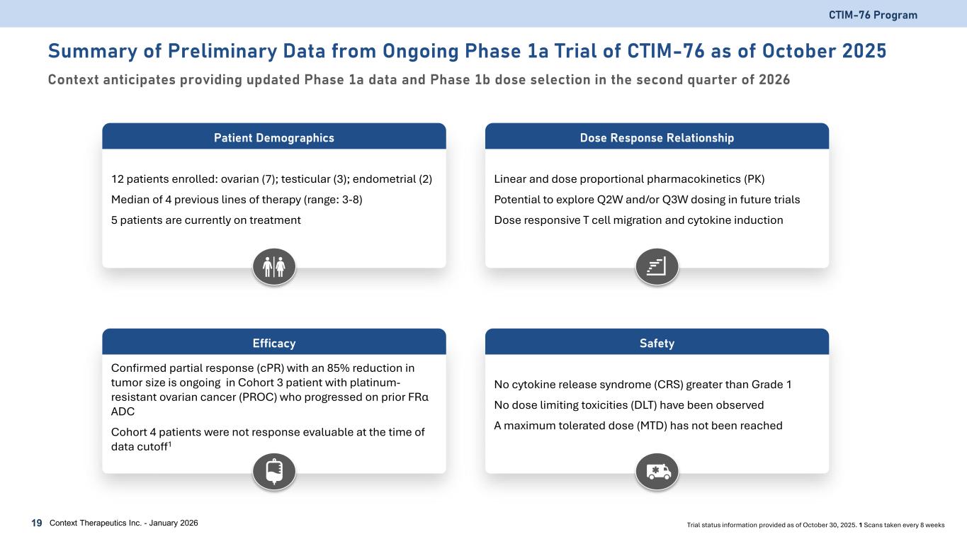 CTIM-76 Phase 1a/b Study An open-label, multi-center, dose escalation / expansion, safety, and PK study (NCT06515613) CTIM-76 Program 18 Context Therapeutics Inc. - January 2026 22.5 70 µg 70 140 µg 140 280 µg 140 560 µg TBD 1,120 µg If required If required Cohort 1 Cohort 2 Cohort 3 Cohort 4 Cohort 5 Cohort 6 Cohort 7 Cohort 8 EC50 ≈ 200 µg 22.5 µg MABEL Dose Completed (n=1) Completed (n=3) Completed (n=4) Completed (n=4) Enrolling (n≥3) Target population • Ovarian, endometrial and testicular cancer relapsed to standard of care • CLDN6+ positive via IHC (≥10% 1+ staining) Trial objectives • Assess safety and tolerability at increasing dose levels • Pharmacokinetic and pharmacodynamic data • Evaluate preliminary anti-tumor activity Dosing and Administration • Weekly IV infusion • Single step dose • Pretreat patients with 16 mg dexamethasone 1 hour prior to C1D1 and C1D8 doses Phase 1a Dose Escalation Trial status information provided as of January 5, 2026