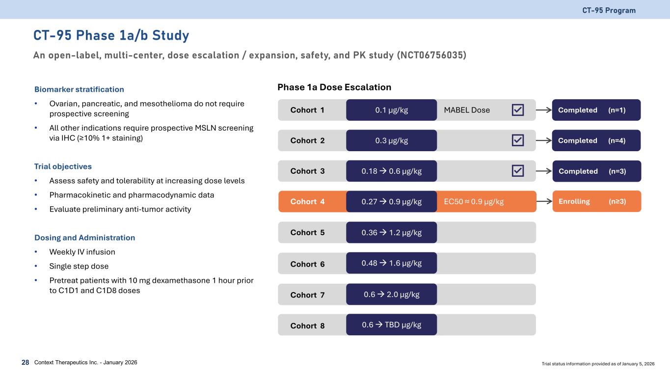 CT-95 is Highly Active and Well Tolerated Across In Vivo Models Complete tumor regressions in mice at doses ≤ 0.05 mg/kg CT-95 Program Context Therapeutics Inc. - January 202627 Primary Lesion Model Metastatic Lesion Model OVCAR3 pre-passaged in mice to generate aggressive, metastatic tumor model Ovarian cancer line OVCAR3 flank implantation tumor model Vehicle Control CT-95 0.05 mg/kg Day 1 Day 70 Day 2 Day 16 Vehicle Control CT-95 0.05 mg/kg CT-95 0.1 mg/kg CT-95 0.5 mg/kg