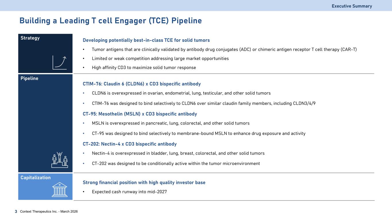Building a Leading T cell Engager (TCE) Pipeline Executive Summary Strategy Developing potentially best-in-class TCE for solid tumors • Tumor antigens that are clinically validated by antibody drug conjugates (ADC) or chimeric antigen receptor T cell therapy (CAR-T) • Limited or weak competition addressing large market opportunities • High affinity CD3 to maximize solid tumor response Pipeline CTIM-76: Claudin 6 (CLDN6) x CD3 bispecific antibody • CLDN6 is overexpressed in ovarian, endometrial, lung, testicular, and other solid tumors • CTIM-76 was designed to bind selectively to CLDN6 over similar claudin family members, including CLDN3/4/9 CT-95: Mesothelin (MSLN) x CD3 bispecific antibody • MSLN is overexpressed in pancreatic, lung, colorectal, and other solid tumors • CT-95 was designed to bind selectively to membrane-bound MSLN to enhance drug exposure and activity CT-202: Nectin-4 x CD3 bispecific antibody • Nectin-4 is overexpressed in bladder, lung, breast, colorectal, and other solid tumors • CT-202 was designed to be conditionally active within the tumor microenvironment Capitalization Strong financial position with high quality investor base • Expected cash runway into mid-2027 Context Therapeutics Inc. - March 20263