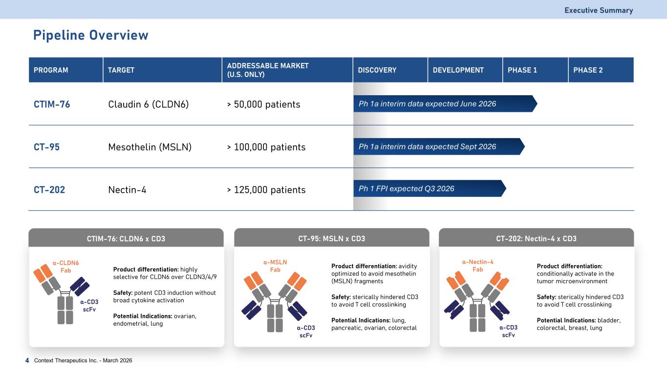 Important Notice and Disclaimers Except for statements of historical fact, any information contained in this presentation may be a forward-looking statement that reflects the Company’s current views about future events and is subject to risks, uncertainties, assumptions and changes in circumstances that may cause events or the Company’s actual activities or results to differ significantly from those expressed in any forward-looking statement. In some cases, you can identify forward-looking statements by terminology such as “may”, “will”, “should”, “plan”, “predict”, “expect”, “estimate”, “anticipate”, “intend”, “goal”, “strategy”, “believe”, “could”, “would”, “potential”, “project”, “continue” and similar expressions and variations thereof. Forward-looking statements may include statements regarding the Company’s business strategy, cash flows, cash runway and funding status, potential growth opportunities, clinical development activities, the timing and results of preclinical research, clinical trials and potential regulatory approval and commercialization of product candidates. Although the Company believes that the expectations reflected in such forward-looking statements are reasonable, the Company cannot guarantee future events, results, actions, levels of activity, performance or achievements. Any forward-looking statements are subject to a number of risks, uncertainties and assumptions, including those described under the heading “Risk Factors” in documents the Company has filed with the SEC. Any forward-looking statements speak only as of the date of this presentation and the Company undertakes no obligation to revise or update any forward-looking statements to reflect events or circumstances after the date hereof. Certain information contained in this presentation relates to or is based on studies, publications, surveys and other data obtained from third-party sources and the Company's own internal estimates and research. While the Company believes these third-party sources to be reliable as of the date of this presentation, it has not independently verified, and makes no representation as to the adequacy, fairness, accuracy or completeness of, any information obtained from third-party sources. In addition, all of the market data included in this presentation involves a number of assumptions and limitations, and there can be no guarantee as to the accuracy or reliability of such assumptions. This presentation discusses product candidates that are under preclinical and clinical study, and which have not yet been approved for marketing by the U.S. Food and Drug Administration. No representation is made as to the safety or effectiveness of these product candidates for the use for which such product candidates are being studied. While the Company believes its internal research is reliable, such research has not been verified by any independent source. All the scientific, preclinical and clinical data presented within this presentation are – by definition prior to completion of the clinical trial and a clinical study report – preliminary in nature and subject to further quality checks including customary source data verification. The trademarks included herein are the property of the owners thereof and are used for reference purposes only. Such use should not be construed as an endorsement of such products. Forward Looking Statement Executive Summary Context Therapeutics Inc. - March 20262