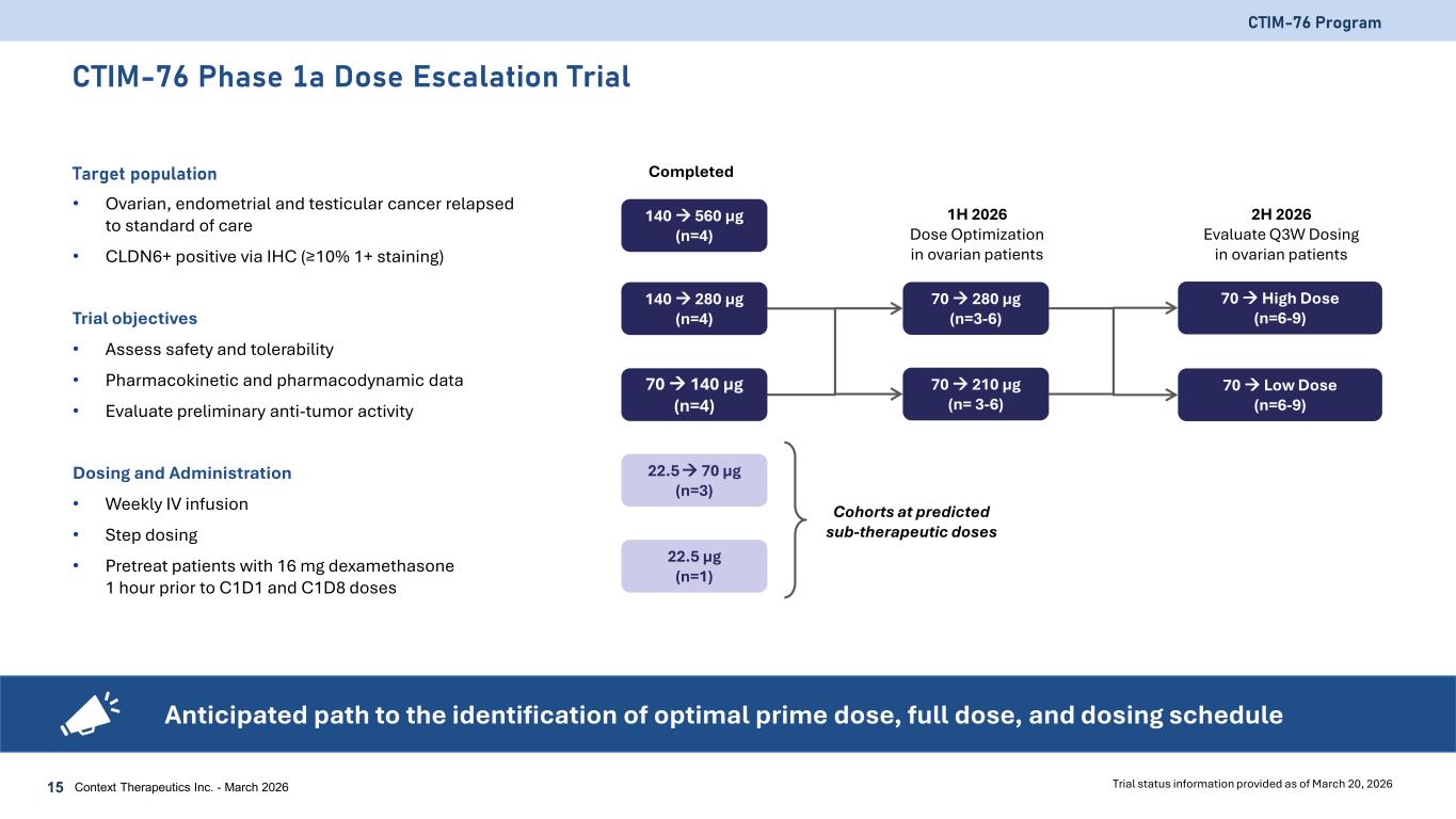 CTIM-76 Program CTIM-76 is a Highly Selective and Potent CLDN6 x CD3 Bispecific Antibody Context Therapeutics Inc. - March 202614 Selectivity Potency In Vivo Efficacy • CTIM-76 CLDN6 EC50 of 3.41 nM (binding) • CTIM-76 preferentially binds to CLDN6 over CLDN3/4/9 • CLDN3/4/6/9 were transiently transfected in HEK-293F cells >10,000x • Potency assay provides a better assessment for a TCE bispecific than binding assays for off-target liabilities associated with CLDN3, CLDN4, or CLDN9 • CTIM-76 CLDN6 EC50 of 0.0004 nM (cytotoxicity) • CTIM-76 preferentially targets CLDN6, with minimal binding and cytotoxicity against CLDN9-expressing cells >500x 0 150 300 450 600 0 7 14 21 Tu m or V ol um e (m m 3) Day Vehicle 0.01mg/kg 0.1mg/kg 1.0mg/kg Tumor Regression • CTIM-76 effectively engaged systemically administered human PBMC cells to promote significant tumor regression and complete responses in OVCAR3 (~96,000 CLDN6 copies per cell) ovarian xenograft models in mice • CTIM-76 was well tolerated in OVCAR3 xenograft study • NSG-b2m knockout mice (n=14/arm) engrafted with human PBMCs and bearing advanced subcutaneous OVCAR3 tumor xenografts were treated twice per week