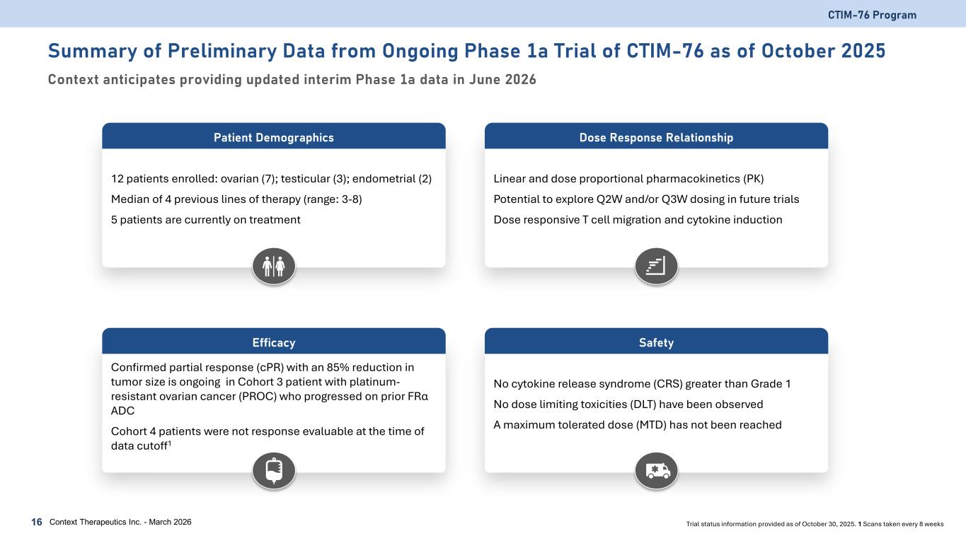 CTIM-76 Phase 1a Dose Escalation Trial Target population • Ovarian, endometrial and testicular cancer relapsed to standard of care • CLDN6+ positive via IHC (≥10% 1+ staining) Trial objectives • Assess safety and tolerability • Pharmacokinetic and pharmacodynamic data • Evaluate preliminary anti-tumor activity Dosing and Administration • Weekly IV infusion • Step dosing • Pretreat patients with 16 mg dexamethasone 1 hour prior to C1D1 and C1D8 doses CTIM-76 Program 15 22.5 70 µg (n=3) 70 140 µg (n=4) 22.5 µg (n=1) Anticipated path to the identification of optimal prime dose, full dose, and dosing schedule 140 280 µg (n=4) 140 560 µg (n=4) Cohorts at predicted sub-therapeutic doses 70 210 µg (n= 3-6) 70 280 µg (n=3-6) 1H 2026 Dose Optimization in ovarian patients 70 Low Dose (n=6-9) 70 High Dose (n=6-9) 2H 2026 Evaluate Q3W Dosing in ovarian patients Completed Trial status information provided as of March 20, 2026Context Therapeutics Inc. - March 2026