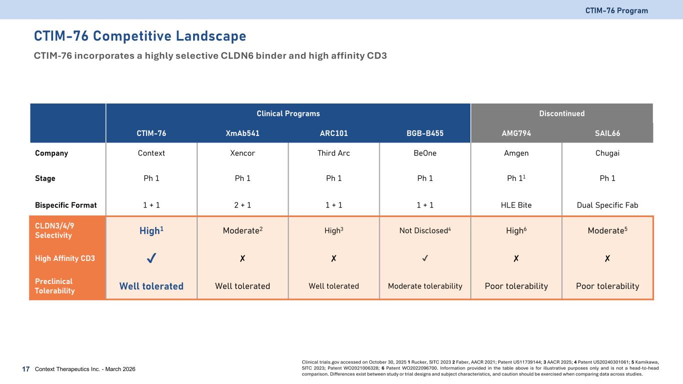 Clinical Programs Discontinued CTIM-76 XmAb541 ARC101 BGB-B455 AMG794 SAIL66 Company Context Xencor Third Arc BeOne Amgen Chugai Stage Ph 1 Ph 1 Ph 1 Ph 1 Ph 11 Ph 1 Bispecific Format 1 + 1 2 + 1 1 + 1 1 + 1 HLE Bite Dual Specific Fab CLDN3/4/9 Selectivity High1 Moderate2 High3 Not Disclosed4 High6 Moderate5 High Affinity CD3 ✘ ✘ ✘ ✘ Preclinical Tolerability Well tolerated Well tolerated Well tolerated Moderate tolerability Poor tolerability Poor tolerability CTIM-76 Program 17 Clinical trials.gov accessed on October 30, 2025 1 Rucker, SITC 2023 2 Faber, AACR 2021; Patent US11739144; 3 AACR 2025; 4 Patent US20240301061; 5 Kamikawa, SITC 2023; Patent WO2021006328; 6 Patent WO2022096700. Information provided in the table above is for illustrative purposes only and is not a head-to-head comparison. Differences exist between study or trial designs and subject characteristics, and caution should be exercised when comparing data across studies. Context Therapeutics Inc. - March 2026 CTIM-76 Competitive Landscape CTIM-76 incorporates a highly selective CLDN6 binder and high affinity CD3