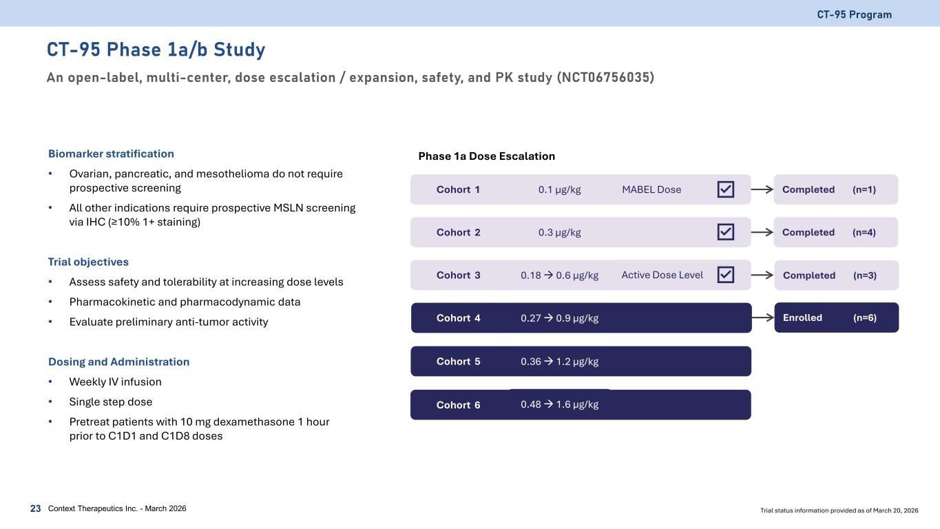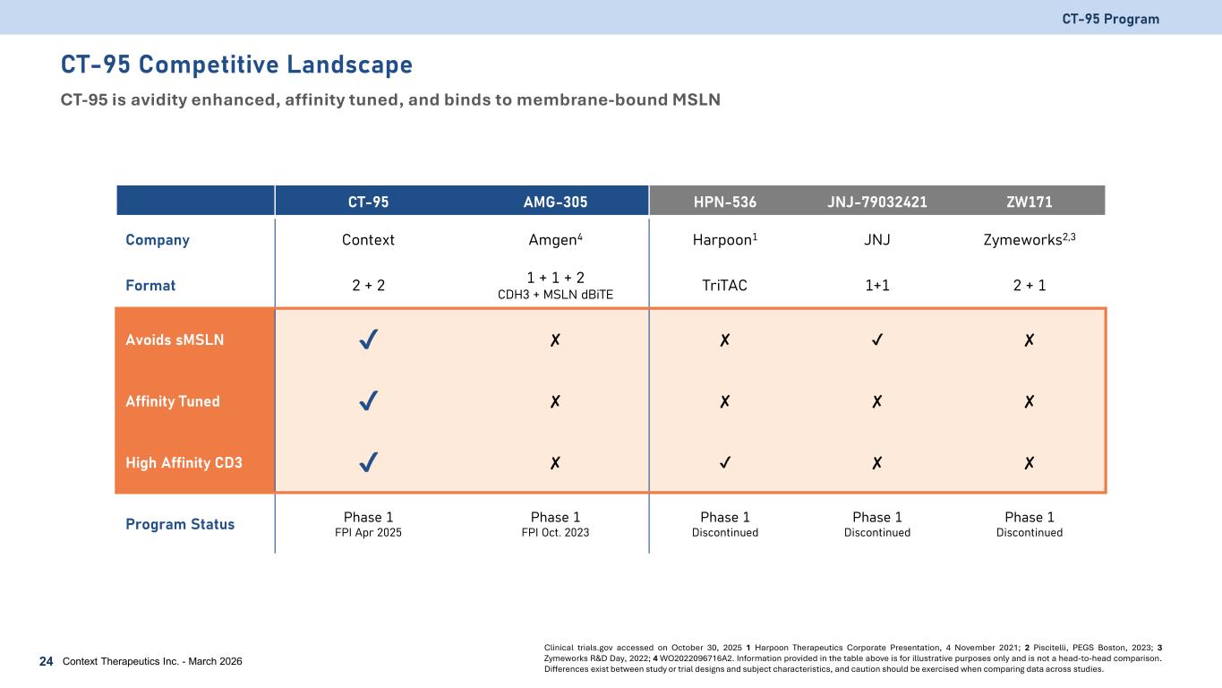 CT-95 Phase 1a/b Study An open-label, multi-center, dose escalation / expansion, safety, and PK study (NCT06756035) CT-95 Program 23 Context Therapeutics Inc. - March 2026 Trial status information provided as of March 20, 2026 0.3 µg/kg 0.18 0.6 µg/kg 0.27 0.9 µg/kg 0.36 1.2 µg/kg 0.48 1.6 µg/kg Cohort 1 Cohort 2 Cohort 3 Cohort 4 Cohort 5 Cohort 6 Active Dose Level 0.1 µg/kg MABEL Dose Completed (n=1) Completed (n=4) Phase 1a Dose EscalationBiomarker stratification • Ovarian, pancreatic, and mesothelioma do not require prospective screening • All other indications require prospective MSLN screening via IHC (≥10% 1+ staining) Trial objectives • Assess safety and tolerability at increasing dose levels • Pharmacokinetic and pharmacodynamic data • Evaluate preliminary anti-tumor activity Dosing and Administration • Weekly IV infusion • Single step dose • Pretreat patients with 10 mg dexamethasone 1 hour prior to C1D1 and C1D8 doses Enrolled (n=6) Completed (n=3)