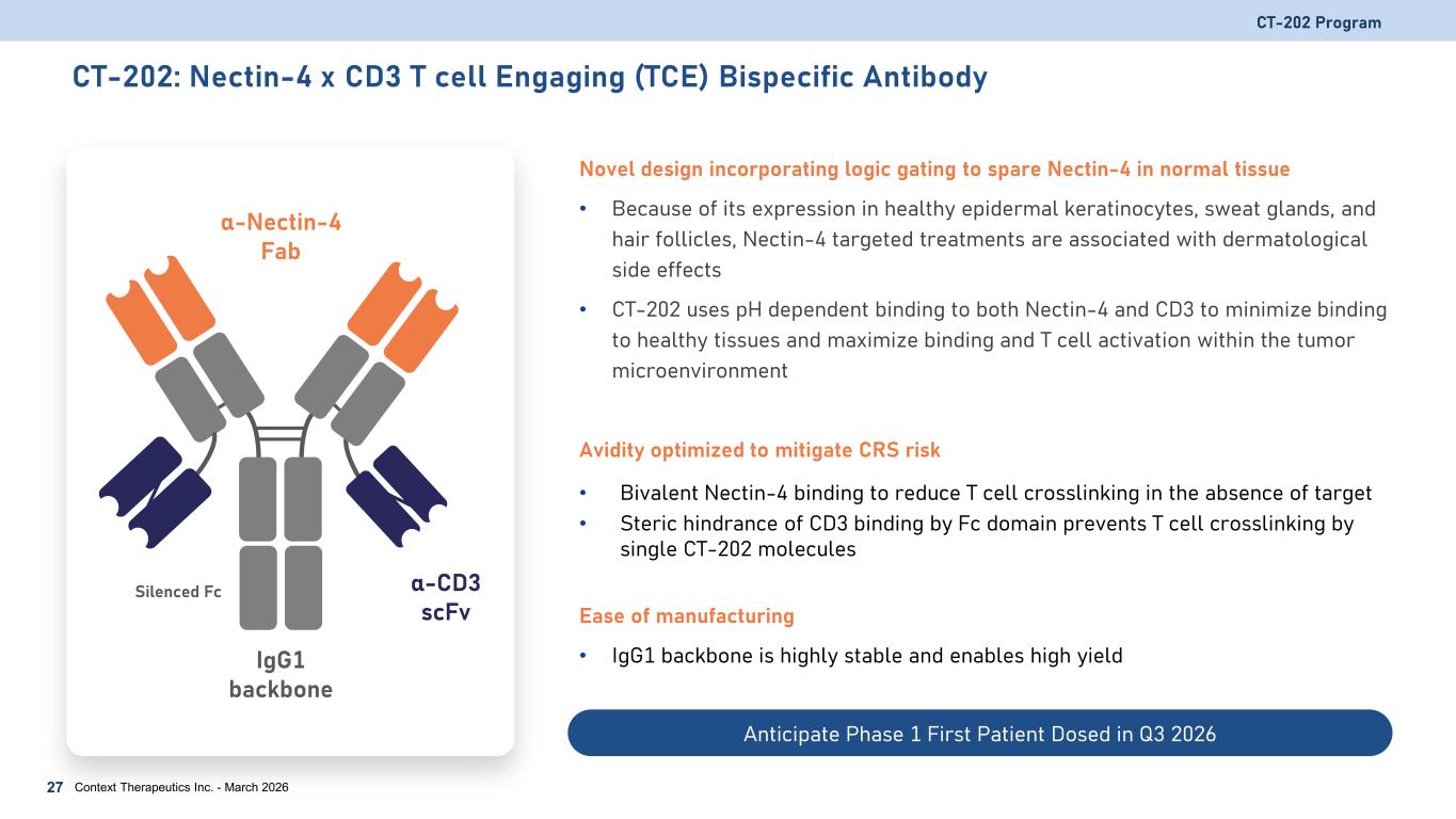 Nectin-4 Therapies Have the Potential to Reach a Large Patient Population >125,000 patients per year in the United States in Relapse/Refractory (R/R) Setting CT-202 Program 26 Context Therapeutics Inc. - March 2026 Selected Cancer indications Incidence (US Only) R/R Incidence Nectin-4 Positive Nectin-4 Med/High Patient Population Based on R/R Incidence Colon 152,810 53,010 87%1 78%2 46,119 Bladder (urothelial) 83,190 20,000 83%3 60%3 16,600 Breast (TNBC) 62,054 15,500 78%3 58%5 12,090 Non-Small Cell Lung 201,229 110,653 64%3 58%6 70,818 Pancreatic 66,440 51,750 71%3 37%3 36,743 Head and Neck 54,000 12,000 59%3 18%3 7,080 Esophageal 22,370 16,130 55%3 24%3 8,872 Gastric 26,890 12,000 94%7 60%4 11,280 Initial indications of interest based on: • Nectin-4 prevalence • Patient population size • Target validation via antibody-drug conjugates (ADCs) Incidences based on public estimates; Relapsed/refractory (R/R) or last-line patient population approximated by annual mortality; Patient population derived from Nectin-4 positive population multiplied by R/R incident population. 1 Kobecki, Int J Mol Sci, 2023; 2 Nikanjan, Can Let, 2025; 3 Challita, Can Res, 2016; 4 Zhang, Oncol Lett, 2018; 5 Zeindler, Front Med, 2019; 6 Takano, Mol Bio, 2009; 7 Muro, ESMO Open, 2025