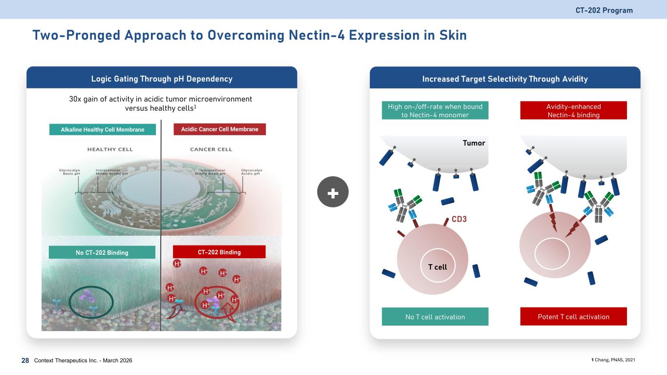 CT-202: Nectin-4 x CD3 T cell Engaging (TCE) Bispecific Antibody CT-202 Program Context Therapeutics Inc. - March 202627 α-Nectin-4 Fab α-CD3 scFv IgG1 backbone Silenced Fc Novel design incorporating logic gating to spare Nectin-4 in normal tissue • Because of its expression in healthy epidermal keratinocytes, sweat glands, and hair follicles, Nectin-4 targeted treatments are associated with dermatological side effects • CT-202 uses pH dependent binding to both Nectin-4 and CD3 to minimize binding to healthy tissues and maximize binding and T cell activation within the tumor microenvironment Avidity optimized to mitigate CRS risk • Bivalent Nectin-4 binding to reduce T cell crosslinking in the absence of target • Steric hindrance of CD3 binding by Fc domain prevents T cell crosslinking by single CT-202 molecules Ease of manufacturing • IgG1 backbone is highly stable and enables high yield Anticipate Phase 1 First Patient Dosed in Q3 2026