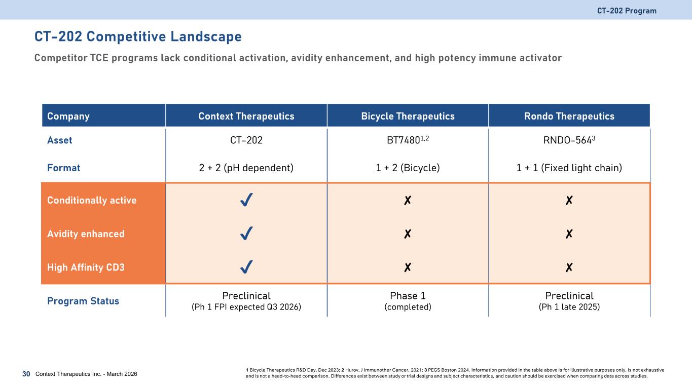 CT-202 Competitive Landscape Competitor TCE programs lack conditional activation, avidity enhancement, and high potency immune activator Context Therapeutics Inc. - March 202630 Company Context Therapeutics Bicycle Therapeutics Rondo Therapeutics Asset CT-202 BT74801,2 RNDO-5643 Format 2 + 2 (pH dependent) 1 + 2 (Bicycle) 1 + 1 (Fixed light chain) Conditionally active ✘ ✘ Avidity enhanced ✘ ✘ High Affinity CD3 ✘ ✘ Program Status Preclinical (Ph 1 FPI expected Q3 2026) Phase 1 (completed) Preclinical (Ph 1 late 2025) 1 Bicycle Therapeutics R&D Day, Dec 2023; 2 Hurov, J Immunother Cancer, 2021; 3 PEGS Boston 2024. Information provided in the table above is for illustrative purposes only, is not exhaustive and is not a head-to-head comparison. Differences exist between study or trial designs and subject characteristics, and caution should be exercised when comparing data across studies. CT-202 Program