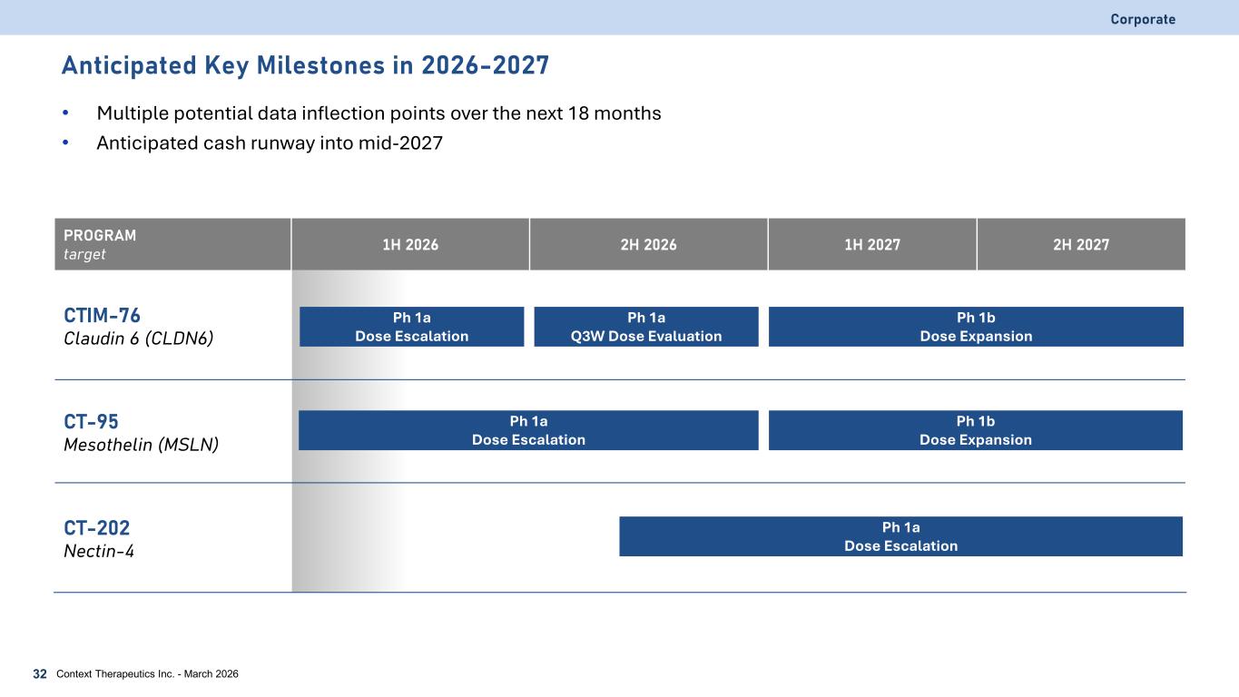 Anticipated Key Milestones in 2026-2027 • Multiple potential data inflection points over the next 18 months • Anticipated cash runway into mid-2027 Corporate PROGRAM target 1H 2026 2H 2026 1H 2027 2H 2027 CTIM-76 Claudin 6 (CLDN6) CT-95 Mesothelin (MSLN) CT-202 Nectin-4 Ph 1a Dose Escalation Ph 1a Q3W Dose Evaluation Ph 1b Dose Expansion Ph 1a Dose Escalation Ph 1b Dose Expansion Ph 1a Dose Escalation Context Therapeutics Inc. - March 202632