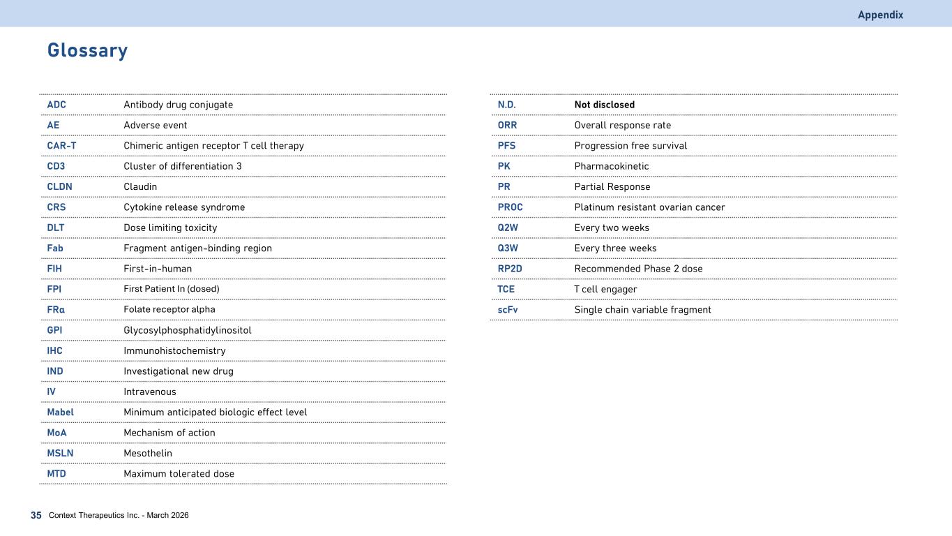 Glossary ADC Antibody drug conjugate AE Adverse event CAR-T Chimeric antigen receptor T cell therapy CD3 Cluster of differentiation 3 CLDN Claudin CRS Cytokine release syndrome DLT Dose limiting toxicity Fab Fragment antigen-binding region FIH First-in-human FPI First Patient In (dosed) FRα Folate receptor alpha GPI Glycosylphosphatidylinositol IHC Immunohistochemistry IND Investigational new drug IV Intravenous Mabel Minimum anticipated biologic effect level MoA Mechanism of action MSLN Mesothelin MTD Maximum tolerated dose Appendix Context Therapeutics Inc. - March 202635 N.D. Not disclosed ORR Overall response rate PFS Progression free survival PK Pharmacokinetic PR Partial Response PROC Platinum resistant ovarian cancer Q2W Every two weeks Q3W Every three weeks RP2D Recommended Phase 2 dose TCE T cell engager scFv Single chain variable fragment