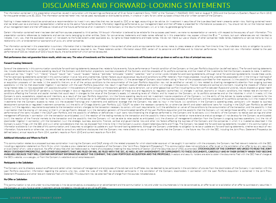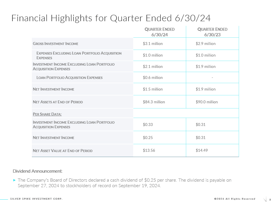 2 SILVER SPIKE INVESTMENT CORP. ©2024 All Rights Reserved DISCLAIMERS AND FORWARD - LOOKING STATEMENTS The information contained in this presentation should be viewed in conjunction with the earnings conference call of Silver Spike Investment Corp . (“SSIC” or the “Company”) (NASDAQ : SSIC) held on August 9 , 2024 and the Company’s Quarterly Report on Form 10 - Q for the quarter ended June 30 , 2024 . The information contained herein may not be used, reproduced or distributed to others, in whole or in part, for any other purpose without the prior written consent of the Company . Nothing in these materials should be construed as a recommendation to invest in any securities that may be issued by SSIC or as legal, accounting or tax advice . An investment in securities of the type described herein presents certain risks . Nothing contained herein shall be relied upon as a promise or representation whether as to the past or future performance . Information regarding performance by our management team and their affiliates is presented for informational purposes only . You should not rely on the historical record of our management team and their affiliates as indicative of the future performance of an investment in the Company or the returns the Company will, or is likely to, generate going forward . Certain information contained herein has been derived from sources prepared by third parties . While such information is believed to be reliable for the purposes used herein, we make no representation or warranty with respect to the accuracy of such information . This presentation contains references to trademarks and service marks belonging to other entities . Solely for convenience, trademarks and trade names referred to in this presentation may appear without the ® or Ť symbols, but such references are not intended to indicate, in any way, that the applicable licensor will not assert, to the fullest extent under applicable law, its rights to these trademarks and trade names . We do not intend our use or display of other companies’ trade names, trademarks or service marks to imply a relationship with, or endorsement or sponsorship of us by, any other companies . The information contained in this presentation is summary information that is intended to be considered in the context of other public announcements that we may make, by press release or otherwise, from time to time . We undertake no duty or obligation to publicly update or revise the information contained in this presentation, except as required by law . These materials contain information about SSIC, certain of its personnel and affiliates and its historical performance . You should not view information related to the past performance of SSIC as indicative of SSIC’s future results, the achievement of which cannot be assured . Past performance does not guarantee future results, which may vary. The value of investments and the income derived from inve stm ents will fluctuate and can go down as well as up. A loss of principal may occur. Forward - Looking Statements Some of the statements in this communication constitute forward - looking statements because they relate to future events, future performance or financial condition of the Company or the Loan Portfolio Acquisition (as defined below) . The forward - looking statements may include statements as to : future operating results of the Company and distribution projections ; business prospects of the Company and the prospects of its portfolio companies ; and the impact of the investments that the Company expects to make . In addition, words such as “may,” “might,” “will,” “intend,” “should,” “could,” “can,” “would,” “expect,” “believe,” “estimate,” “anticipate,” “predict,” “potential,” “plan” or similar words indicate forward - looking statements, although not all forward - looking statements include these words . The forward - looking statements contained in this communication involve risks and uncertainties . Certain factors could cause actual results and conditions to differ materially from those projected, including the uncertainties associated with (i) the timing or likelihood of the Loan Portfolio Acquisition closing ; (ii) the ability to realize the anticipated benefits of the Loan Portfolio Acquisition ; (iii) the percentage of Company stockholders voting in favor of the proposals submitted for their approval ; (iv) the possibility that competing offers or acquisition proposals will be made ; (v) the possibility that any or all of the various conditions to the consummation of the Loan Portfolio Acquisition may not be satisfied or waived ; (vi) risks related to diverting management’s attention from ongoing business operations ; (vii) the risk that stockholder litigation in connection with the Loan Portfolio Acquisition may result in significant costs of defense and liability ; (viii) changes in the economy, financial markets and political environment, including the impacts of inflation and rising interest rates ; (ix) risks associated with possible disruption in the operations of the Company or the economy generally due to terrorism, war or other geopolitical conflict (including the current conflict between Russia and Ukraine), natural disasters or global health pandemics, such as the COVID - 19 pandemic ; (x) future changes in laws or regulations (including the interpretation of these laws and regulations by regulatory authorities) ; (xi) changes in political, economic or industry conditions, the interest rate environment or conditions affecting the financial and capital markets that could result in changes to the value of the Company’s assets ; (xii) elevating levels of inflation, and its impact on the Company, on its portfolio companies and on the industries in which it invests ; (xiii) the Company’s plans, expectations, objectives and intentions, as a result of the Loan Portfolio Acquisition ; 
