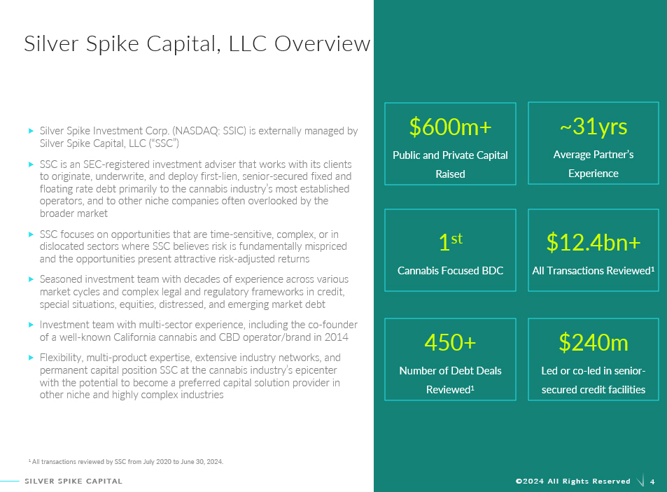 3 SILVER SPIKE INVESTMENT CORP. ©2024 All Rights Reserved Financial Highlights for Quarter Ended 6/30/24 Q UARTER E NDED 6/30/23 Q UARTER E NDED 6/30/24 $2.9 million $3.1 million G ROSS I NVESTMENT I NCOME $1.0 million $1.0 million E XPENSES E XCLUDING L OAN P ORTFOLIO A CQUISITION E XPENSES $1.9 million $2.1 million I NVESTMENT I NCOME E XCLUDING L OAN P ORTFOLIO A CQUISITION E XPENSES - $0.6 million L OAN P ORTFOLIO A CQUISITION E XPENSES $1.9 million $1.5 million N ET I NVESTMENT I NCOME $90.0 million $84.3 million N ET A SSETS AT E ND OF P ERIOD P ER S HARE D ATA : $0.31 $0.33 I NVESTMENT I NCOME E XCLUDING L OAN P ORTFOLIO A CQUISITION E XPENSES $0.31 $0.25 N ET I NVESTMENT I NCOME $14.49 $13.56 N ET A SSET V ALUE AT E ND OF P ERIOD Dividend Announcement : The Company’s Board of Directors declared a cash dividend of $0.25 per share. The dividend is payable on September 27, 2024 to stockholders of record on September 19, 2024.