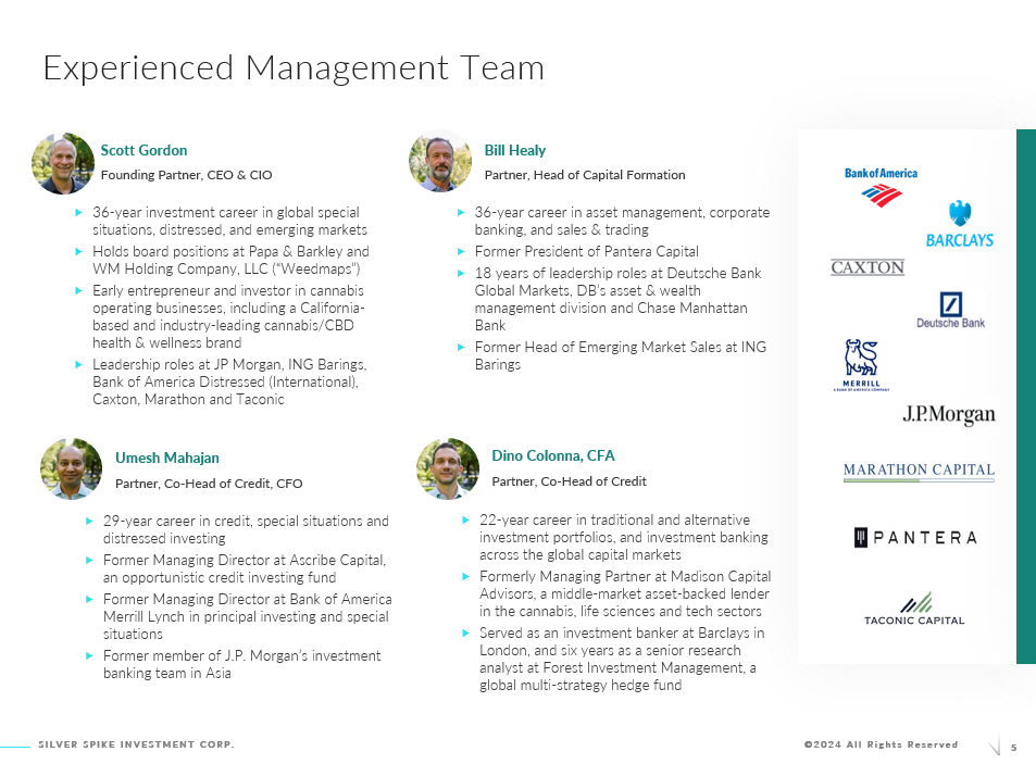 4 SILVER SPIKE CAPITAL ©2024 All Rights Reserved Silver Spike Capital, LLC Overview Silver Spike Investment Corp. (NASDAQ: SSIC) is externally managed by Silver Spike Capital, LLC (“SSC”) SSC is an SEC - registered investment adviser that works with its clients to originate, underwrite, and deploy first - lien, senior - secured fixed and floating rate debt primarily to the cannabis industry’s most established operators, and to other niche companies often overlooked by the broader market SSC focuses on opportunities that are time - sensitive, complex, or in dislocated sectors where SSC believes risk is fundamentally mispriced and the opportunities present attractive risk - adjusted returns Seasoned investment team with decades of experience across various market cycles and complex legal and regulatory frameworks in credit, special situations, equities, distressed, and emerging market debt Investment team with multi - sector experience, including the co - founder of a well - known California cannabis and CBD operator/brand in 2014 Flexibility, multi - product expertise, extensive industry networks, and permanent capital position SSC at the cannabis industry’s epicenter with the potential to become a preferred capital solution provider in other niche and highly complex industries $600m+ Public and Private Capital Raised ~31yrs Average Partner’s Experience 1 st Cannabis Focused BDC $12.4bn+ All Transactions Reviewed 1 450+ Number of Debt Deals Reviewed 1 $240m Led or co - led in senior - secured credit facilities 1 All transactions reviewed by SSC from July 2020 to June 30, 2024.