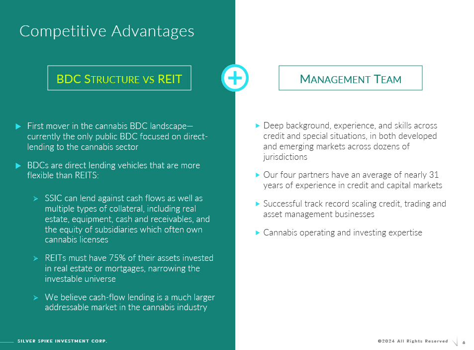 5 SILVER SPIKE INVESTMENT CORP. ©2024 All Rights Reserved Experienced Management Team 36 - year investment career in global special situations, distressed, and emerging markets Holds board positions at Papa & Barkley and WM Holding Company, LLC (“Weedmaps”) Early entrepreneur and investor in cannabis operating businesses, including a California - based and industry - leading cannabis/CBD health & wellness brand Leadership roles at JP Morgan, ING Barings, Bank of America Distressed (International), Caxton, Marathon and Taconic Founding Partner, CEO & CIO Scott Gordon 36 - year career in asset management, corporate banking, and sales & trading Former President of Pantera Capital 18 years of leadership roles at Deutsche Bank Global Markets, DB’s asset & wealth management division and Chase Manhattan Bank Former Head of Emerging Market Sales at ING Barings Partner, Head of Capital Formation Bill Healy 22 - year career in traditional and alternative investment portfolios, and investment banking across the global capital markets Formerly Managing Partner at Madison Capital Advisors, a middle - market asset - backed lender in the cannabis, life sciences and tech sectors Served as an investment banker at Barclays in London, and six years as a senior research analyst at Forest Investment Management, a global multi - strategy hedge fund Partner, Co - Head of Credit Dino Colonna, CFA Partner, Co - Head of Credit, CFO Umesh Mahajan 29 - year career in credit, special situations and distressed investing Former Managing Director at Ascribe Capital, an opportunistic credit investing fund Former Managing Director at Bank of America Merrill Lynch in principal investing and special situations Former member of J.P. Morgan’s investment banking team in Asia